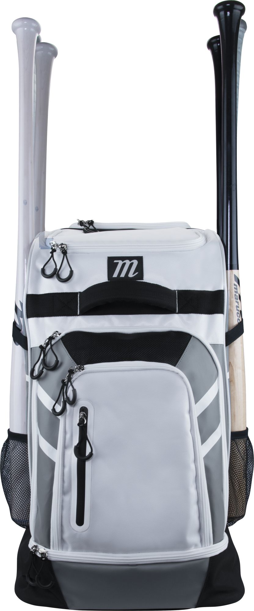 Side sleeves hold up to six bats or catcher’s leg guards