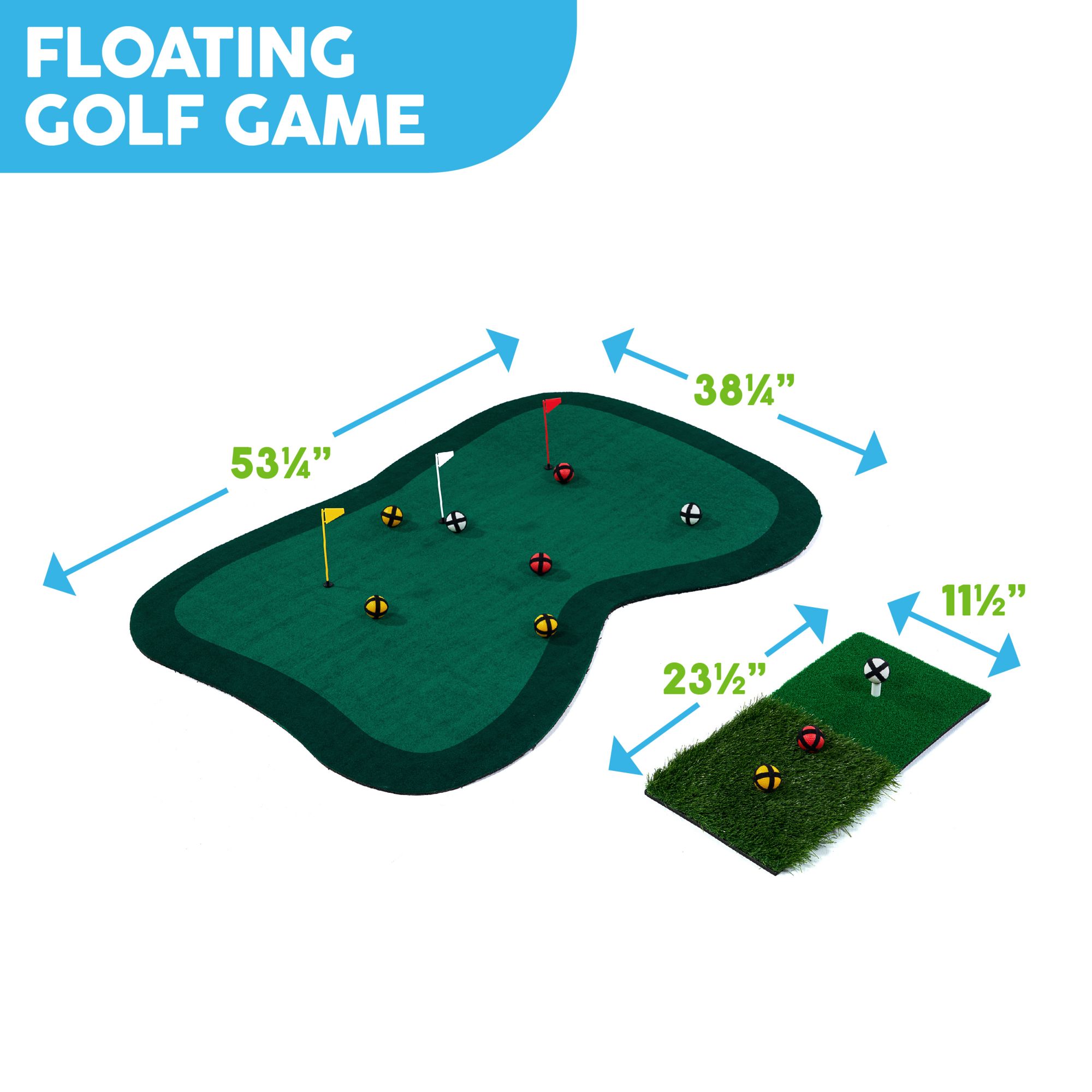 - Floating golf green measures 53.25” x 38.25” with a 13mm thick soft foam pad for stable flotation