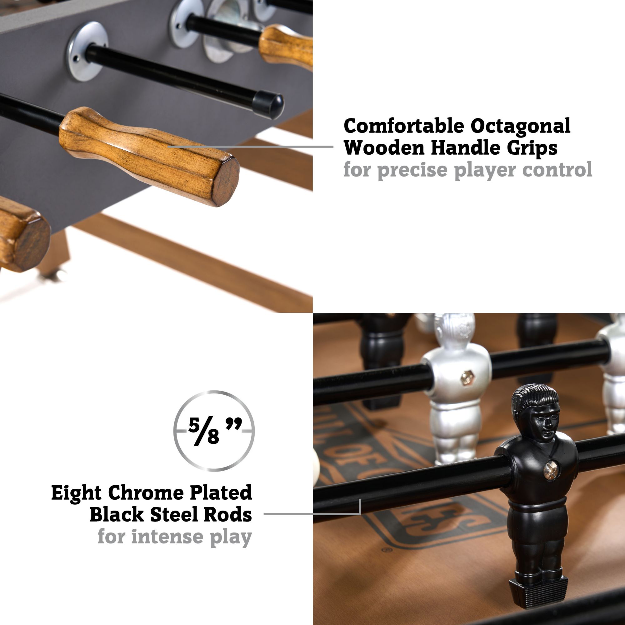 - Competition-size foosball table with 46" x 26.5" playfield