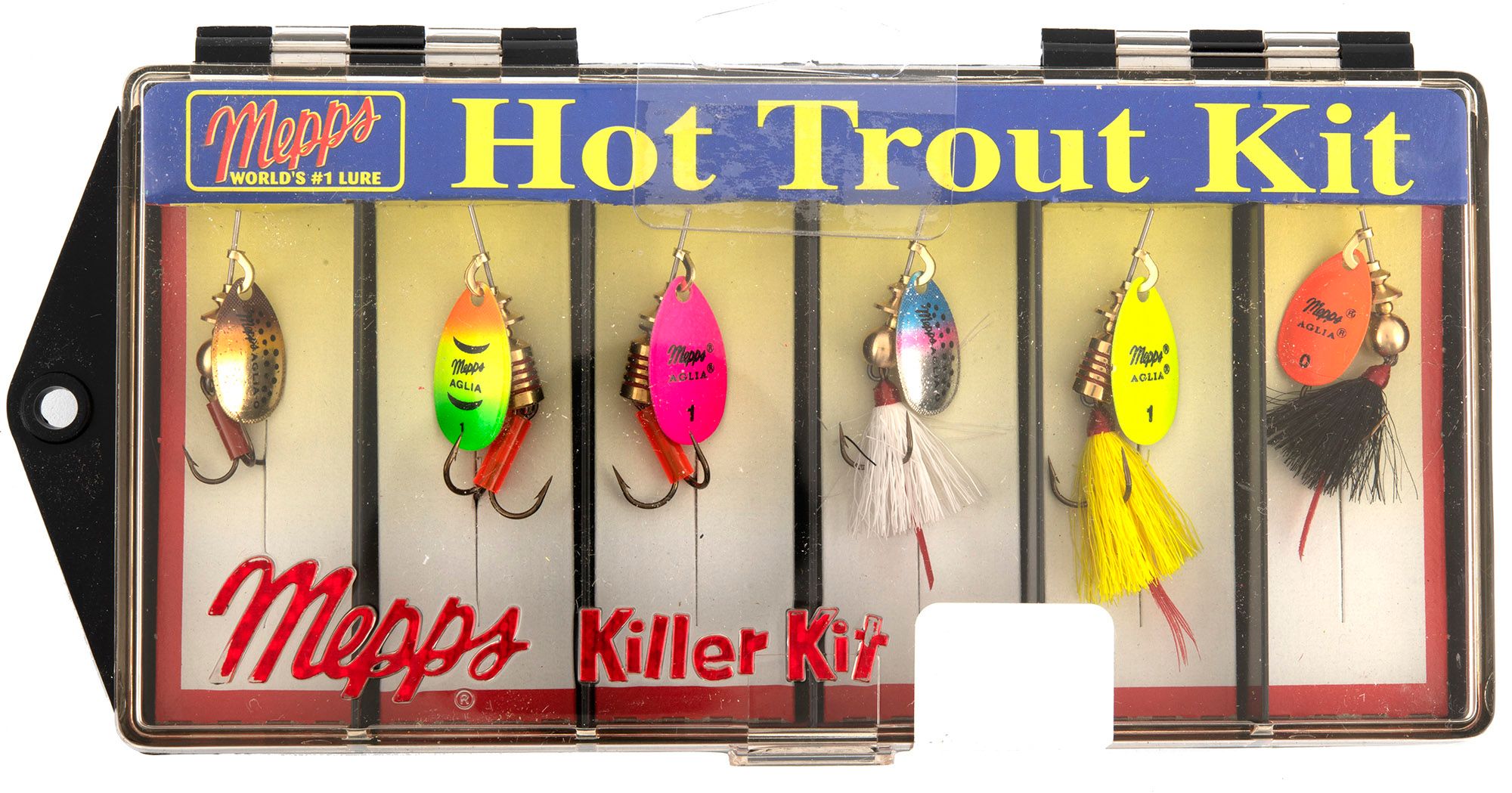 • Lures Included: #0 brown trout blade, #1 hot firetiger blade, #1 hot pink blade, #0 rainbow trout blade-white tail, #1 hot chartreuse blade-yellow tail, #0 hot orange blade-black tail