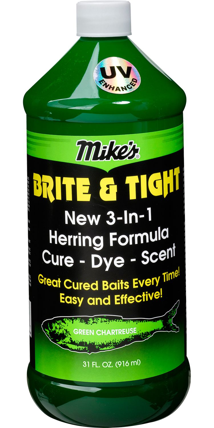 Mike’s Brite & Tight Herring Brine helps herring last longer, fish better, and attract more fish thanks to its 3-in-1 formula. Enhanced with UV, this brine cures, colors, and odorizes your bait with no mixing required – simply pour and soak your herring overnight. Mike’s® Brite & Tight uses its special UV formula to add more visibility in low light environments, so you can target fish not matter the water conditions.