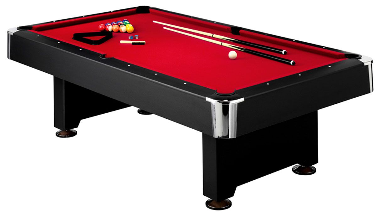 The Mizerak® Donovan II Slate Pool Table will give your game room a contemporary edge, while offering quality performance. Its slick red cloth is wear-resistant and promises a smooth, consistent roll. This 8 FT pool table sits upon reinforced pedestal style legs, and features thick laminate top rails and drop-pockets accented with chrome corner caps. The Donovan II comes complete with a set of balls, 2 sticks, brush, chalk and a rack.