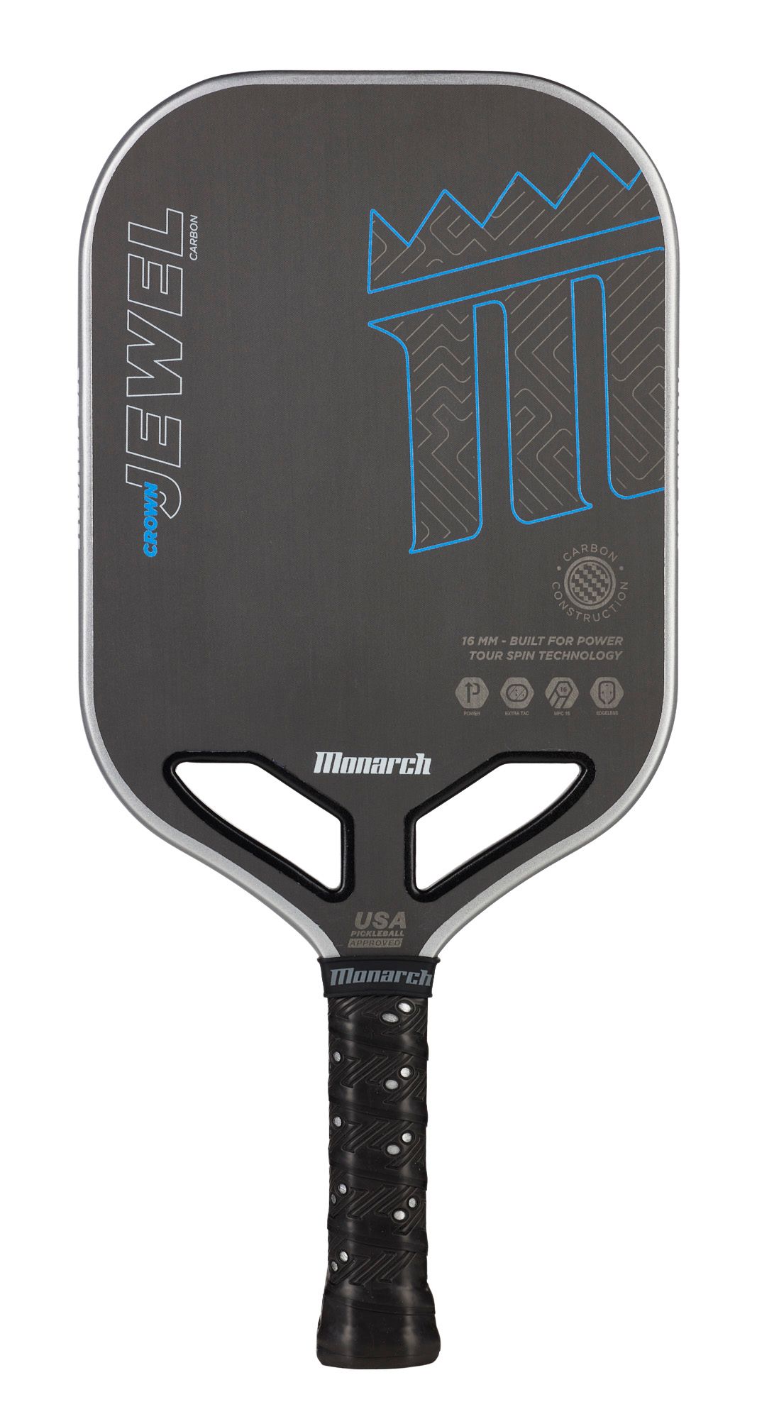 The Crown Jewel Carbon adds control and precision to your game without sacrificing power. An extra thick Monarch PolyCore combined with a raw carbon face increases stability and spin control. In addition, this paddle incorporates a new dual open throat design with center channel for even greater power and performance.