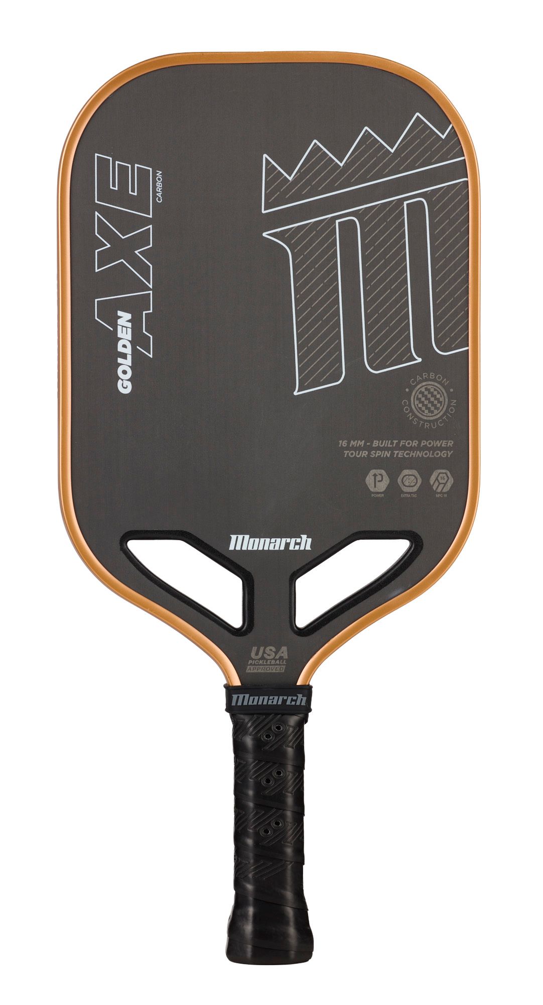 The Golden Axe Carbon is an all-around paddle that can deliver aggressive shots from the baseline in singles play, or forgiveness at the net to hit a hard smash back at your opponents in doubles play. A raw carbon face maximizes spin, while the new dual open throat with center channel provides even greater power and performance.