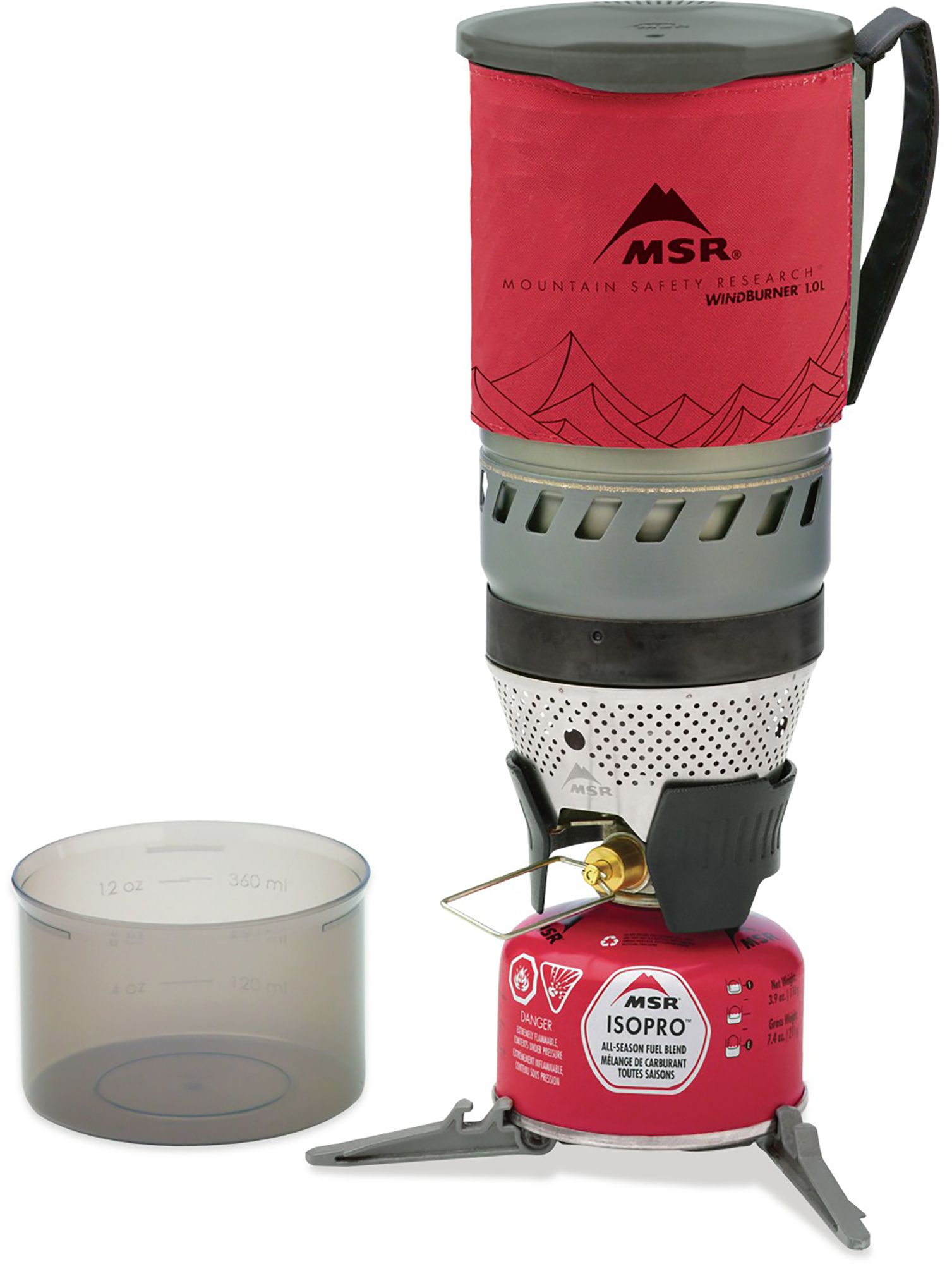 The 1L anodized aluminum pot has an integrated heat exchanger and insulated cozy with handle