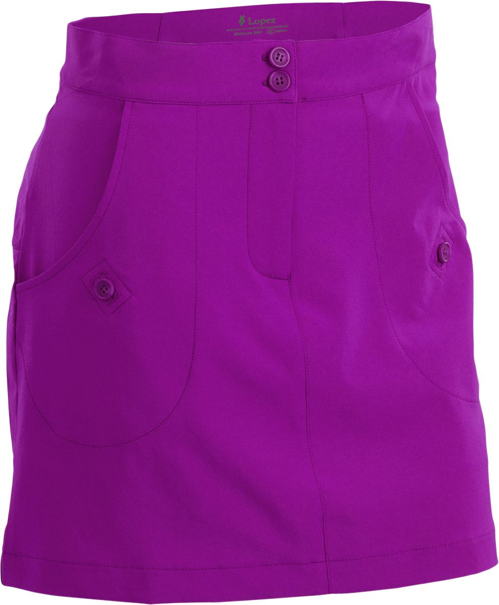 The Nancy Lopez® Charming Golf Skort boosts your confidence on the course by providing a stylish look and performance-enhancing construction. The faux button detail on the front hand pockets and the back seam details with shirring offer classic looks and an improved fit. The back slit pockets give you a place to store your scorecard, while the four-way stretch fabrication with moisture wicking capabilities enhance your movement and comfort.