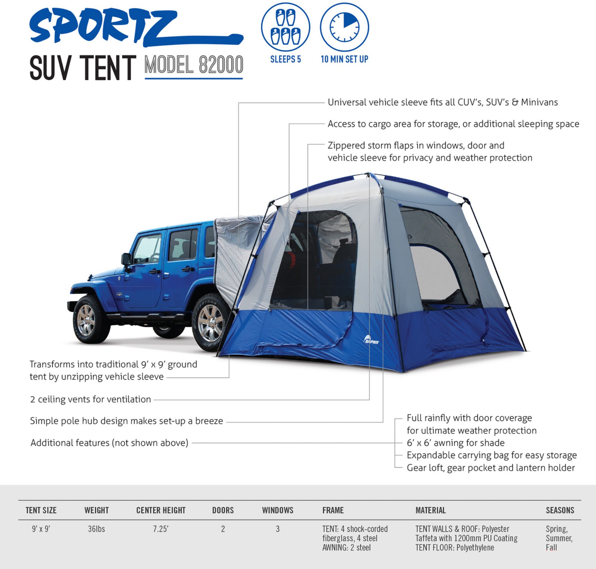 Transform your SUV, CUV or minivan into an outdoor haven with the Sportz® SUV Dome Tent. The roomy, 9’x9’ tent comfortably sleeps four or five people, so no one’s left behind. The SUV tent wraps around the cargo area of your vehicle and allows easy access to the interior. The bathtub-style floor provides exceptional waterproofing, while the steel and fiberglass pole construction makes set-up a simple, one-person job.