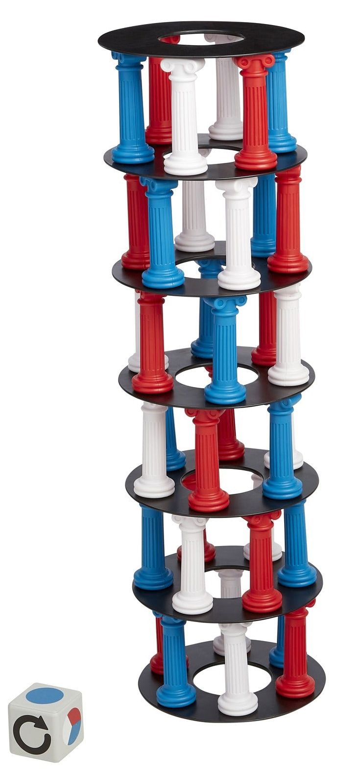 - Includes 36 multi-color 5.25" columns, 7 base plates, one large foam dice and a travel carry bag
