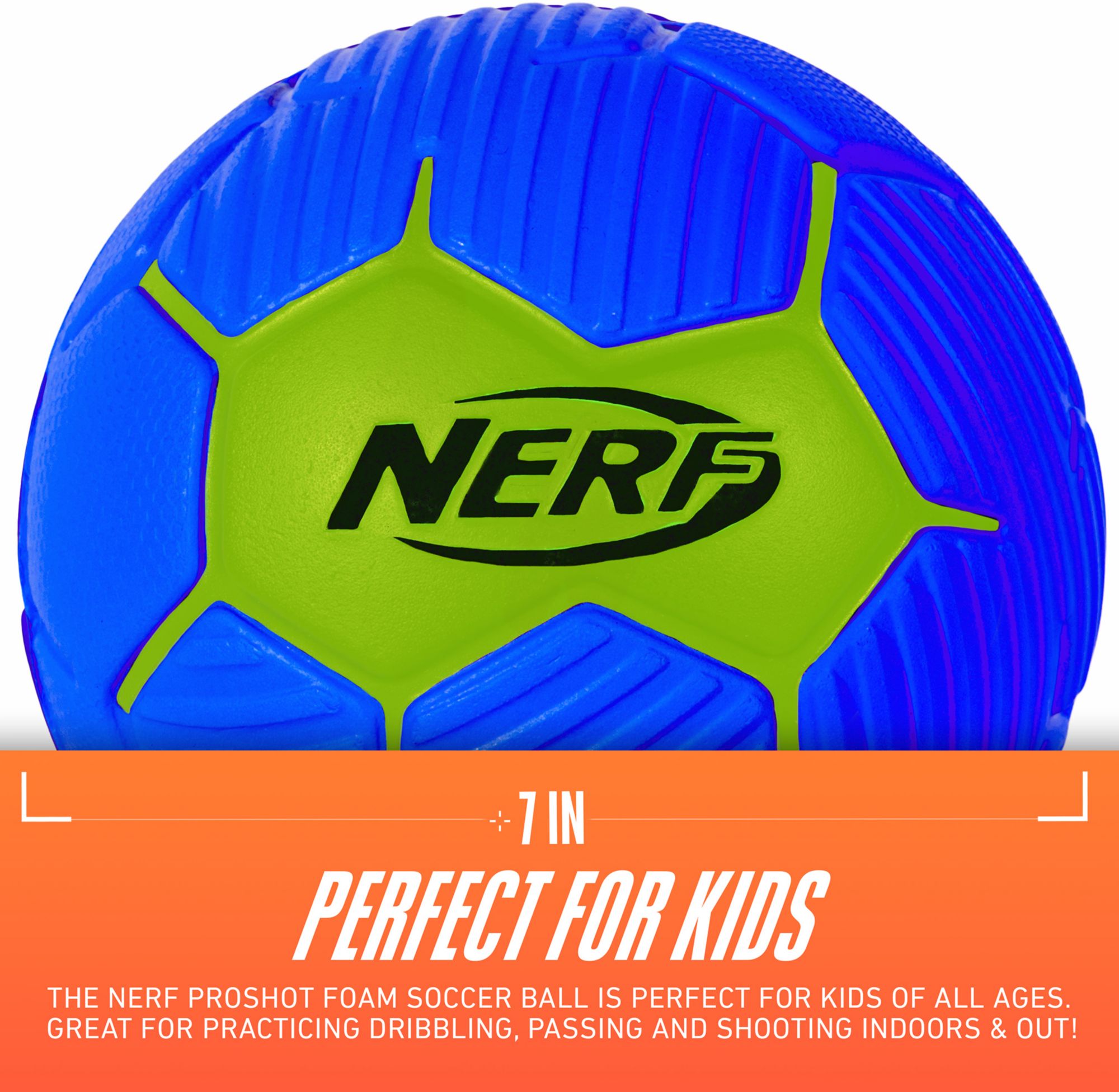 Safely bring the soccer fun indoors with the NERF Proshot Kids Mini Foam Soccer Ball! This kid-sized, mini foam soccer ball is a perfect toy for youth soccer players to practice their skills and have a ton of fun in the process! The 7" inch diameter soccer ball is the perfect size for kids who are just learning the game, and the soft NERF foam construction ensures that they can play anywhere safely. The soft NERF foam construction makes it easy to play outdoors and indoors. Whether kids are out in the backyard or in the living room, this soft NERF foam ball is perfect way to start the soccer fun rain or shine. Plus, this ball is also designed with a textured surface to help kids grip and control the ball with ease. So whether your kids are just learning the game, or trying to improve their skills, the NERF Proshot Kids Mini Foam Soccer Ball is the perfect gift for them!