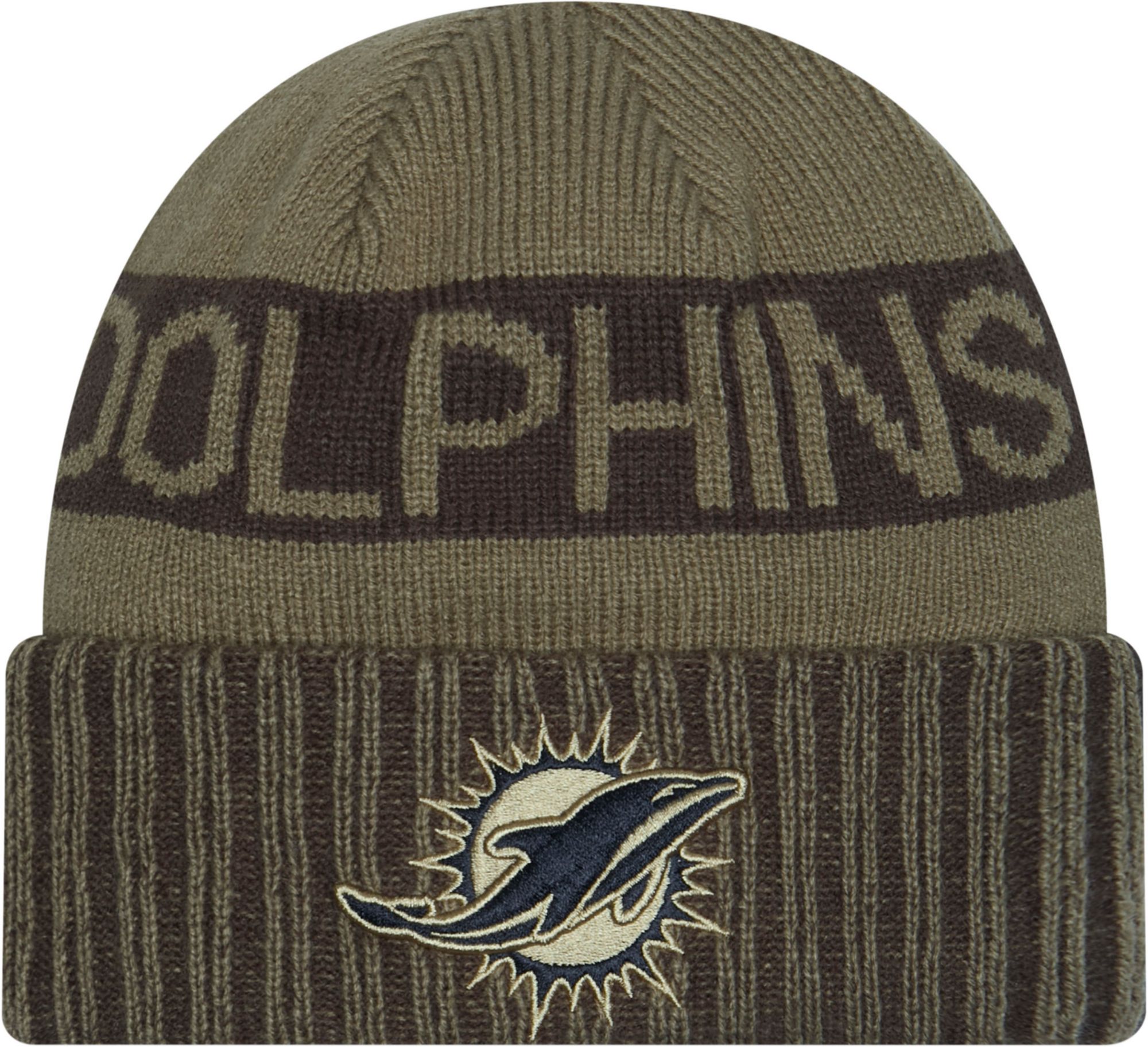 New Era Adult Miami Dolphins Salute To Service 2025 Olive Green Knit Beanie