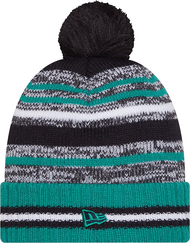• Fold-over cuff and pom top