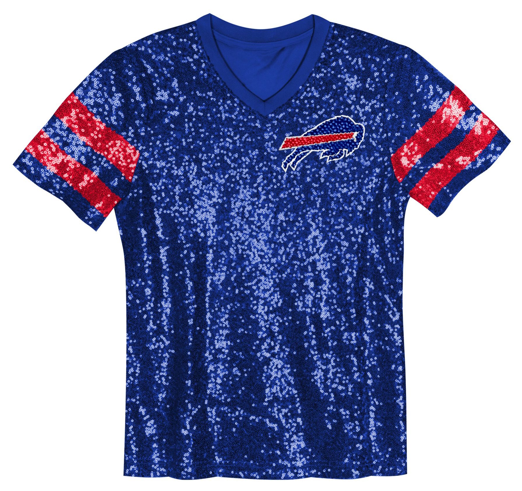 Ordered this online and was really disappointed when I picked it up. The photo shows two thick red stripes and the shirt itself had one two single rows of red sequins. Also, I bought a small (my usual size) and it fit like a dress. Super long and bo