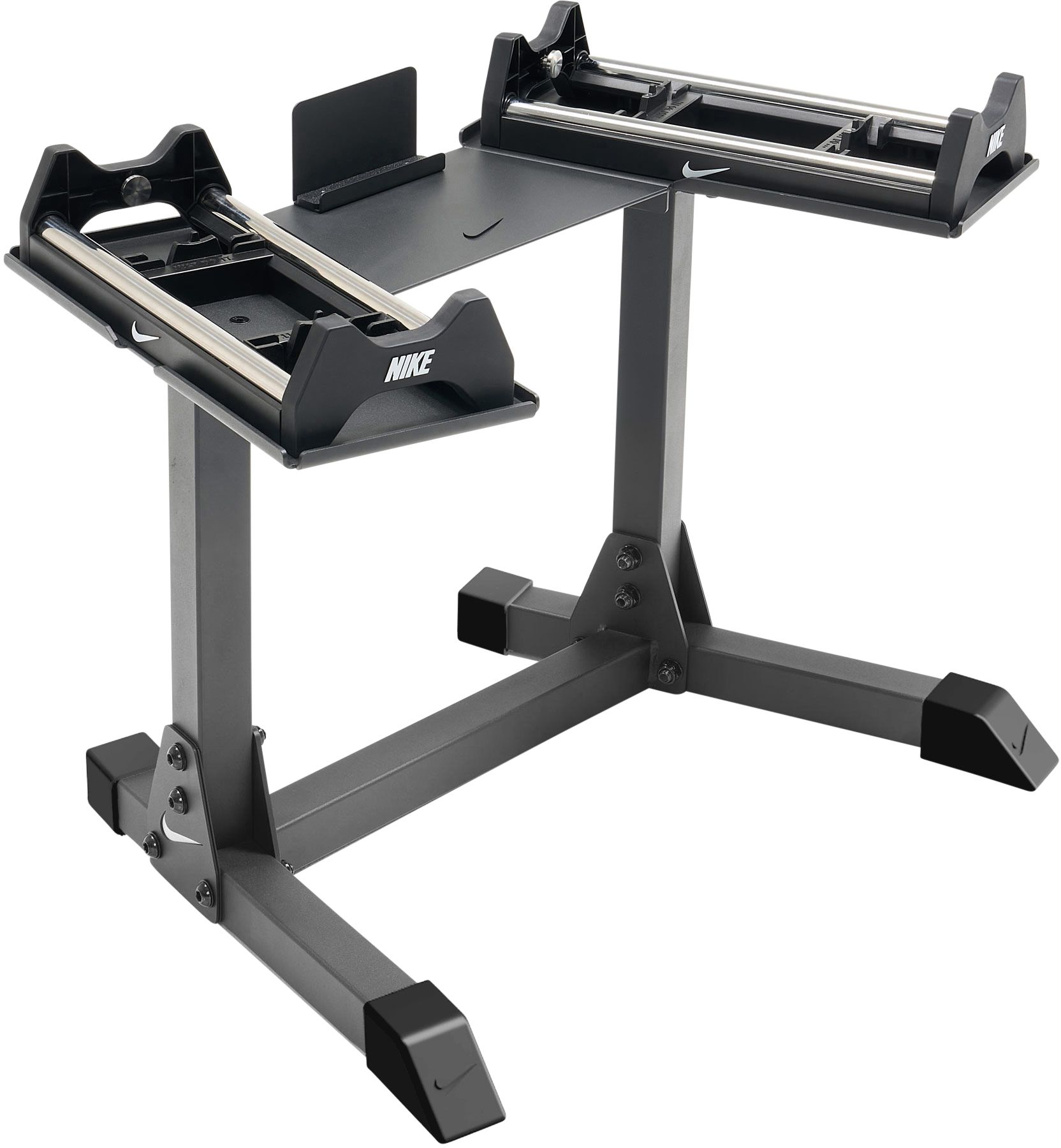 The Nike Adjustable Dumbbell Stand creates the perfect home base for your Nike Adjustable Dumbbells. Built from heavy-duty steel with a durable, powder-coated finish, it’s made to stand up to your toughest sessions. Elevated for ergonomics, it keeps your dumbbells at an optimal height to reduce strain on your back and hips. An integrated storage shelf with a built-in phone holder keeps essentials close, while locked-in cradles hold your dumbbells steady for quick, secure re-racking.