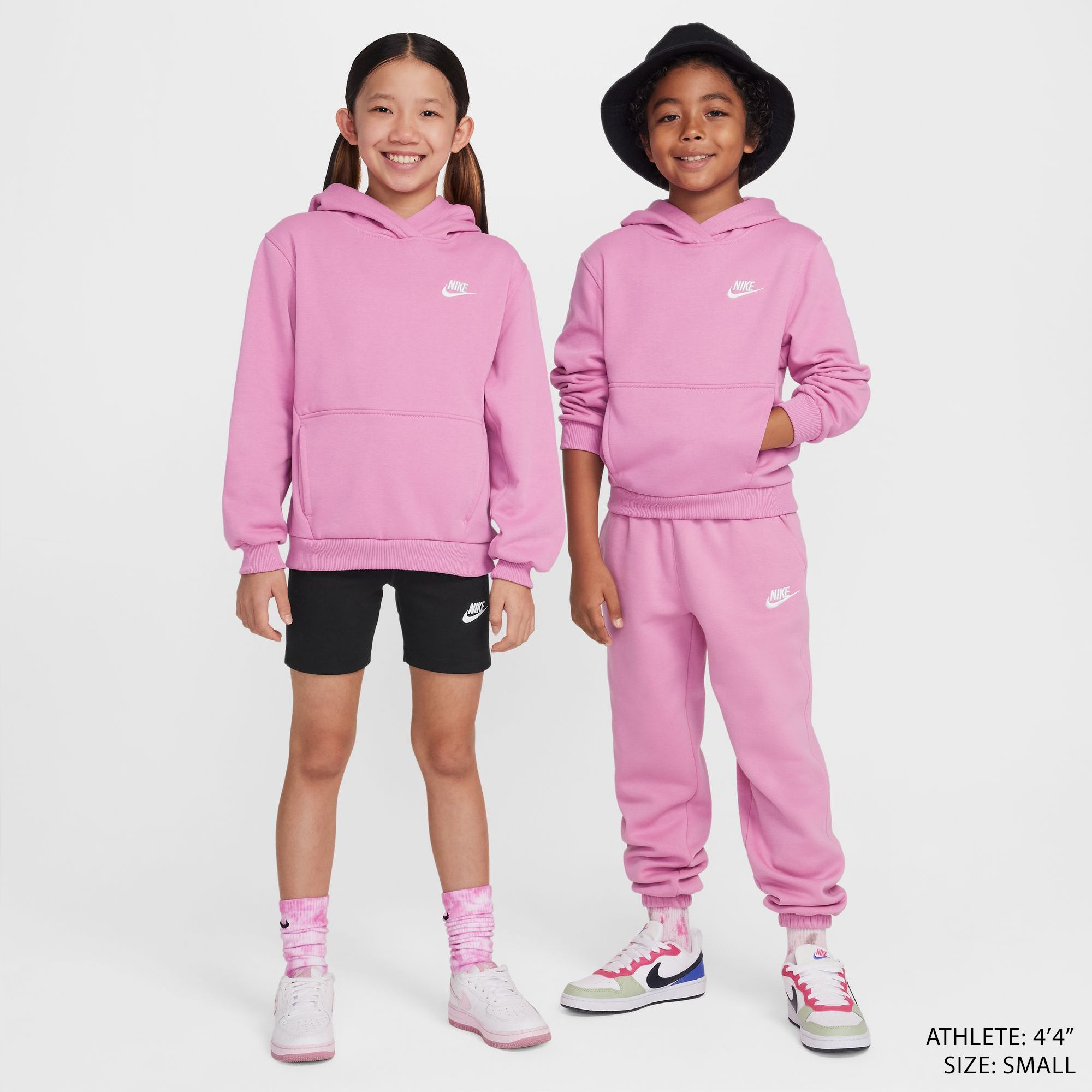Keep your kids cozy and stylish with the Nike All Kids Fit Sportswear Club Fleece Hoodie. This lightweight pullover features a regular fit, ribbed trim, and a crossover hood design for easy wear. The soft fleece interior and large front pocket make it perfect for keeping warm and storing essentials.
