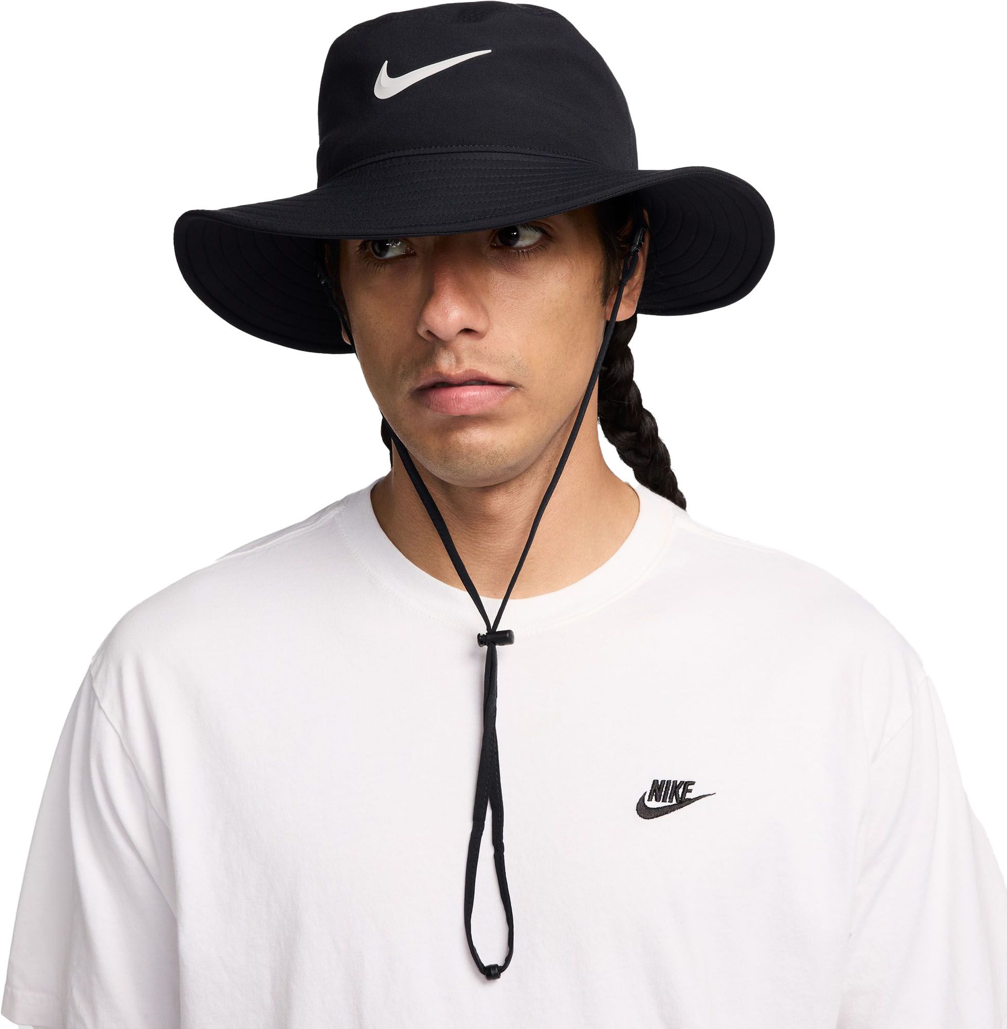 Beat the sun in style with this mid-depth bucket hat. An extra-wide brim gives plenty of 360-degree shade around your face and neck, plus sweat-wicking Dri-FIT technology helps keep your head cool for your warm outdoor excursions. Nike Dri-FIT technology moves sweat away from your skin for quicker evaporation, helping you stay dry and comfortable. Smooth woven has a light and durable feel. Adjustable chin strap keeps the hat in place, or can be removable for a distraction-free fit.