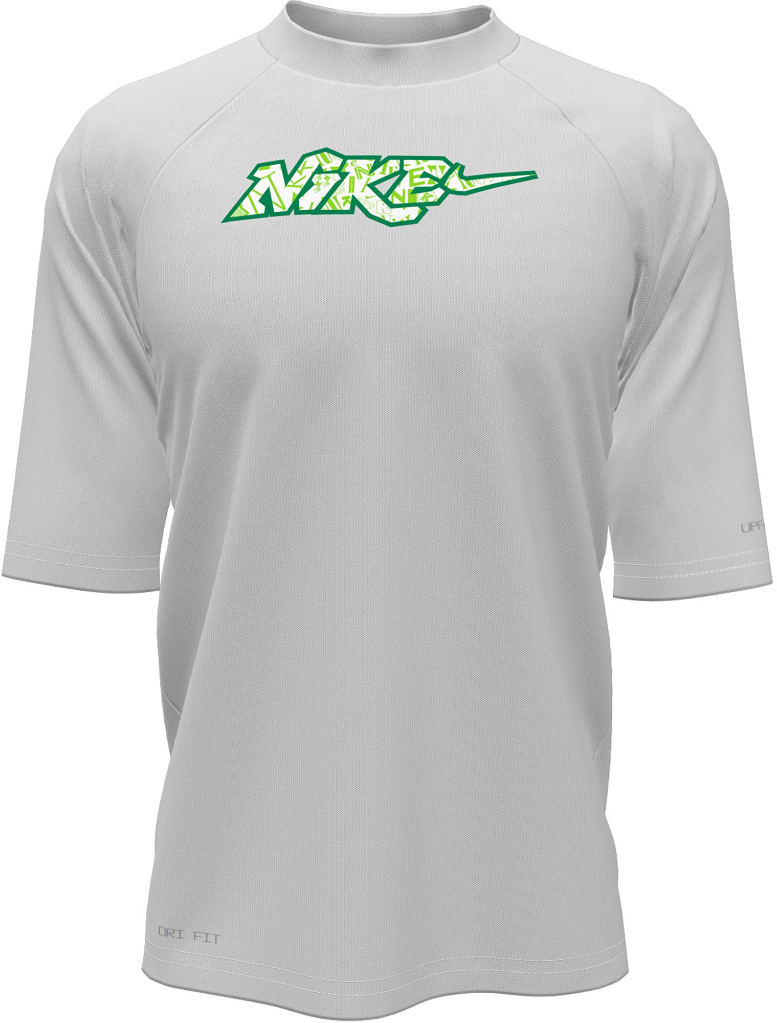 Take your bold style for a swim. With a fun, mashed-up Nike graphic and a lot of color choices you’re sure to catch eyes and rays. But don’t worry, 40 UPF material protects you in all areas covered. Dri-FIT technology ensures you’ll be dry and comfortable. The internal neck tape promises comfort against the skin during all-day play.