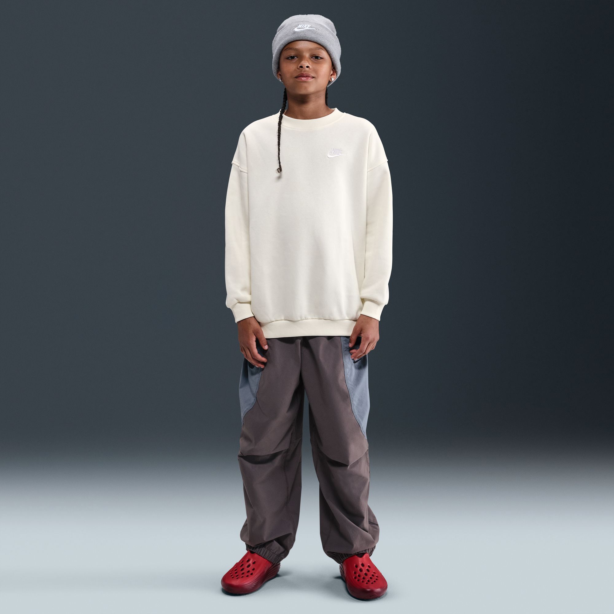 Wrap her in cozy comfort with the Nike Girls' Sportswear Club Fleece Oversized Sweatshirt. Featuring an oversized fit with plenty of space and a crewneck for easy on-and-off wear, this sweatshirt is designed for ultimate relaxation. The lightweight fleece is smooth on the outside, soft on the inside, and the embroidered Futura logo adds a touch of sporty style.