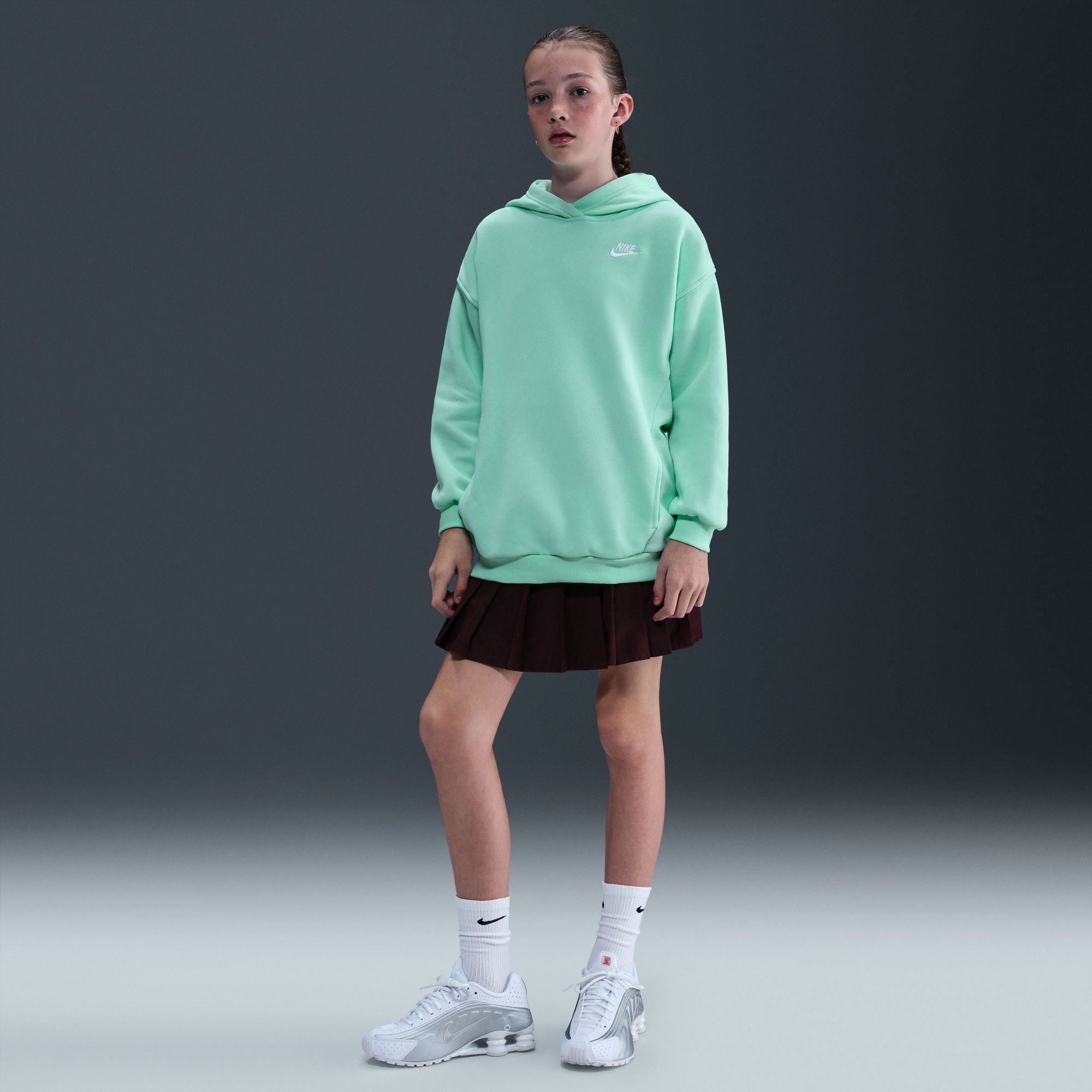 Wrap your young athlete in cozy comfort with the Nike Girls’ Sportswear Oversized Club Fleece Pullover Hoodie. This hoodie boasts a spacious and relaxed fit, featuring dropped shoulders and a smooth exterior with a brushed interior for ultimate softness. With its lightweight fleece, front pockets, and embroidered Futura logo, it's the perfect layer for extra warmth and effortless style.