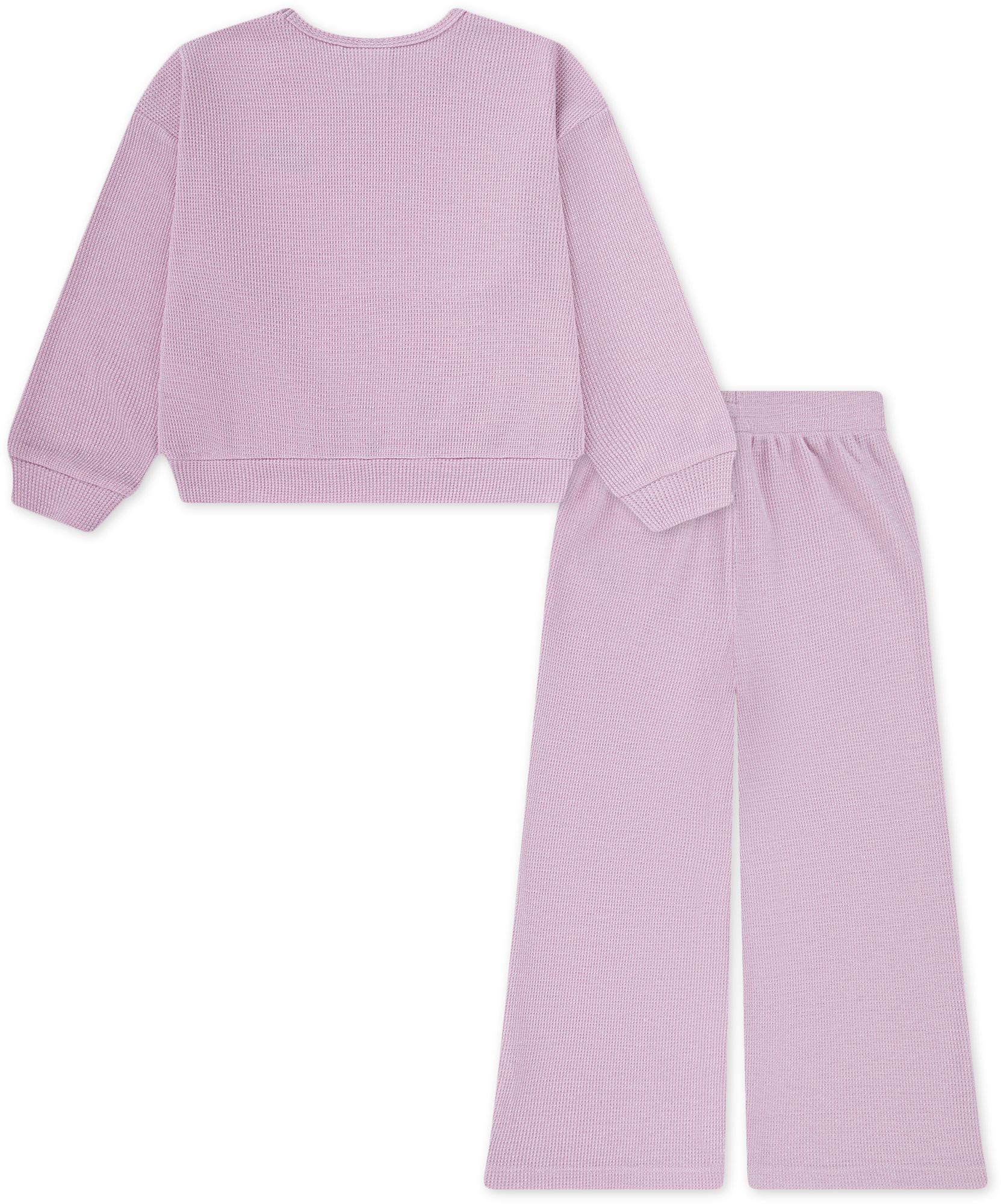 Effortlessly dress your child in festive style they can wear throughout the holidays and beyond with this two-piece set. Both pieces are made of lurex waffle knit fabric that feels soft and gentle on your kiddo's skin, and finished with an allover shimmer that will turn heads. The top is a roomy silhouette with dropped shoulders that relax the fit. The pants have a stretchy waistband for a comfy fit with vented flared legs for ease of movement.