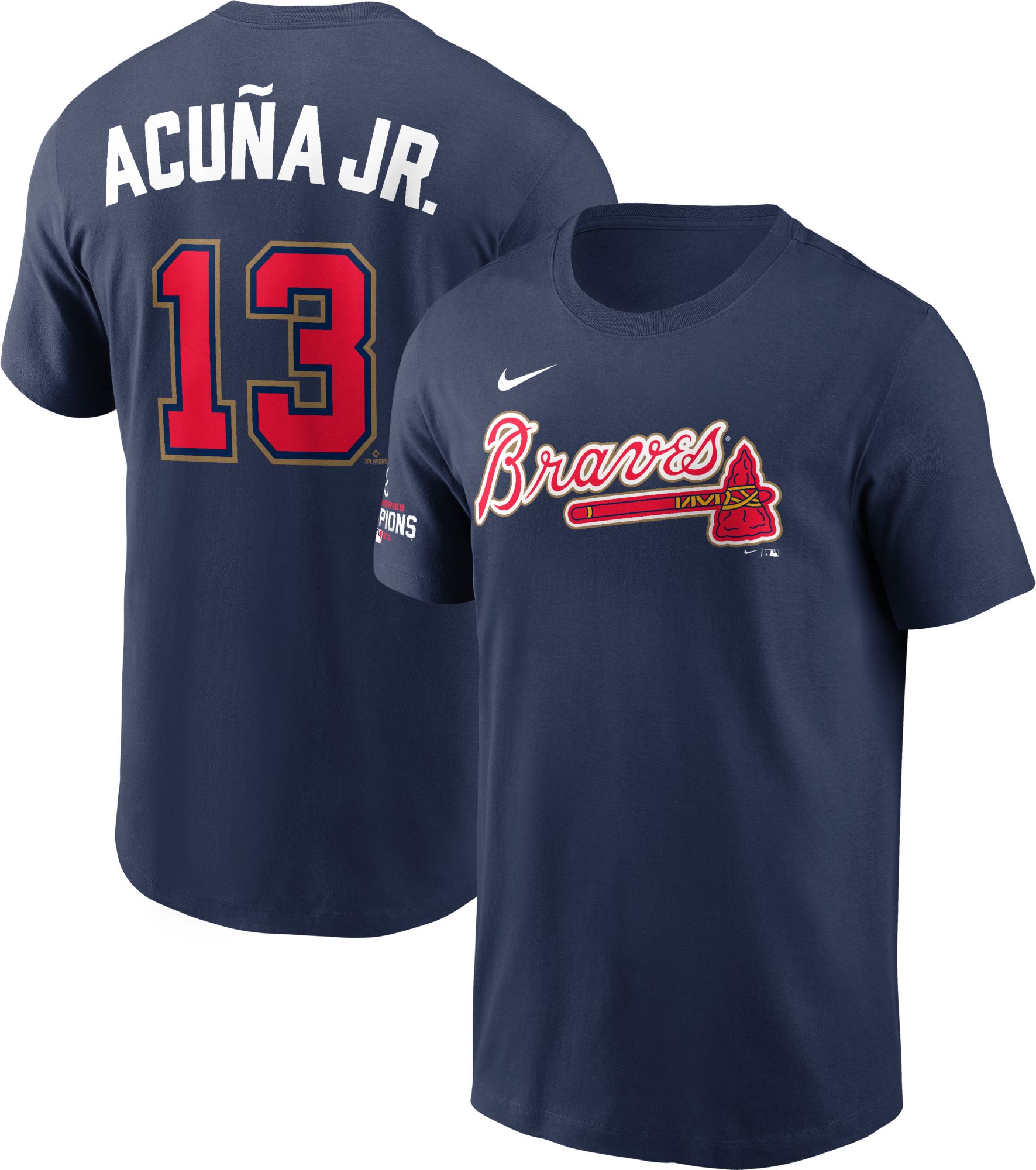 Nike Men's Atlanta Braves Ronald Acuña Jr. #13 2022 Gold Collection Navy Logo T-Shirt