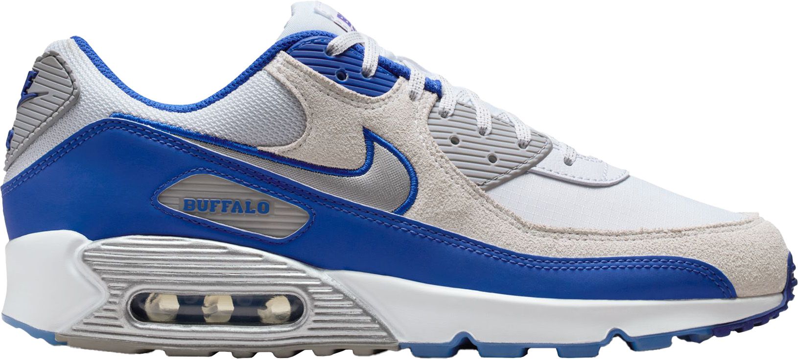 Rep the Buffalo Bills with this Air Max 90 and your team's colors. This shoe stays true to its running roots with an iconic Waffle sole, while stitched overlays and textured accents create the '90s look you love. Its visible cushioning adds comfort to your journey.