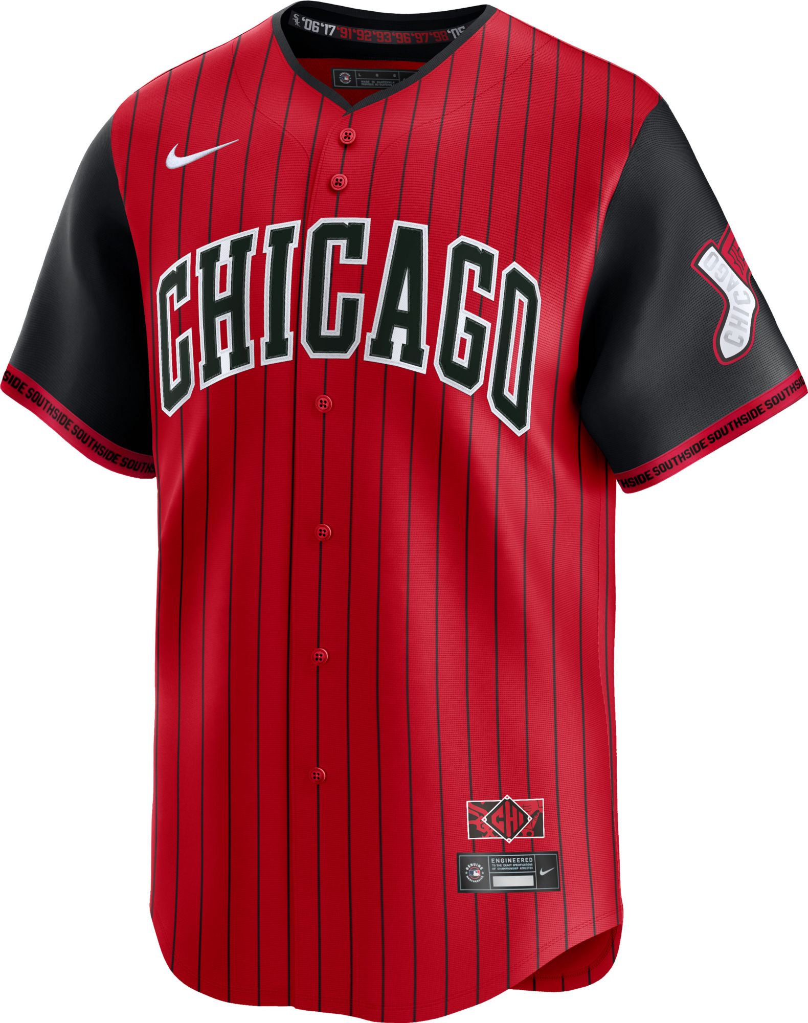 Show your team pride with the Nike Men's Chicago White Sox 2025 City Connect Limited Vapor Jersey. Designed with authentic decoration and trim, this short sleeve, button-front jersey is made of recycled polyester and features stretch mesh gussets under the arms for enhanced range of motion. Stay cool and comfortable with integrated Dri-FIT® moisture-wicking technology, while showcasing your team spirit with the heated Seal Twill team logo and official MLB® batter man logo.
