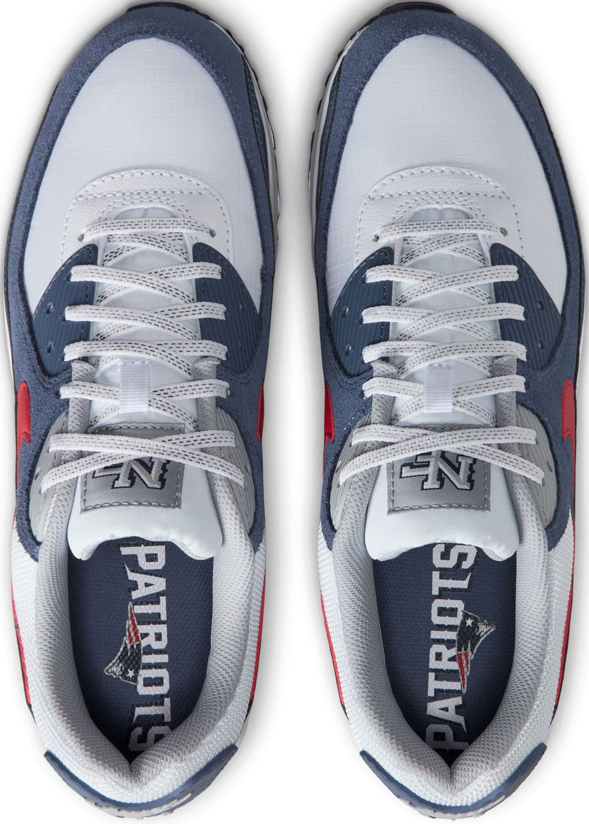 Rep the New England Patriots with this Air Max 90 and your team's colors. This shoe stays true to its running roots with an iconic Waffle sole, while stitched overlays and textured accents create the '90s look you love. Its visible cushioning adds comfort to your journey.