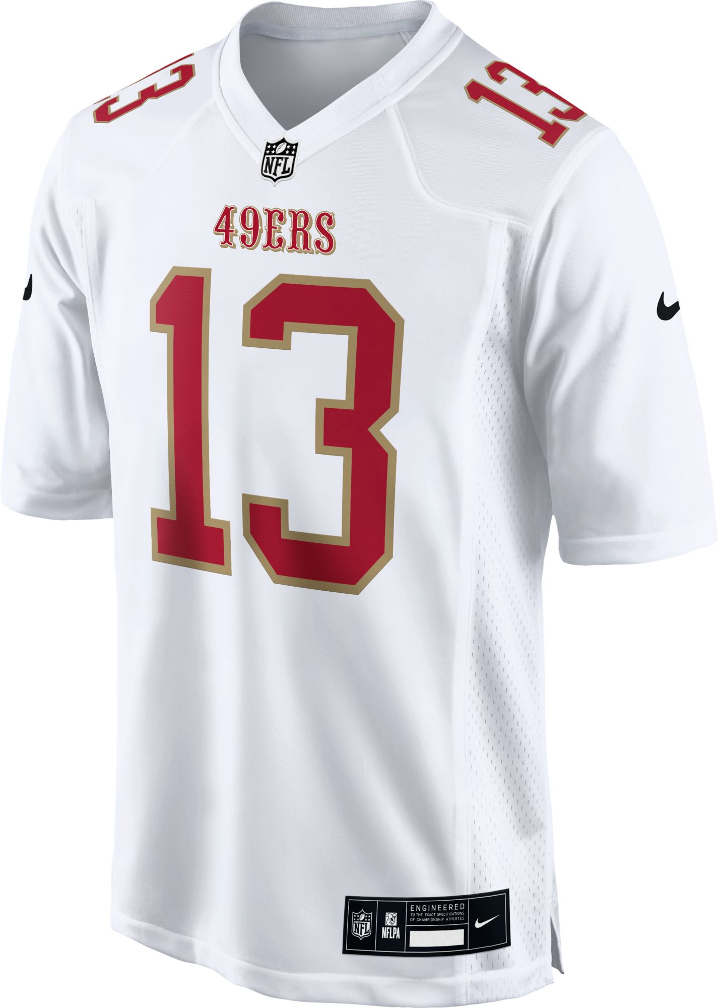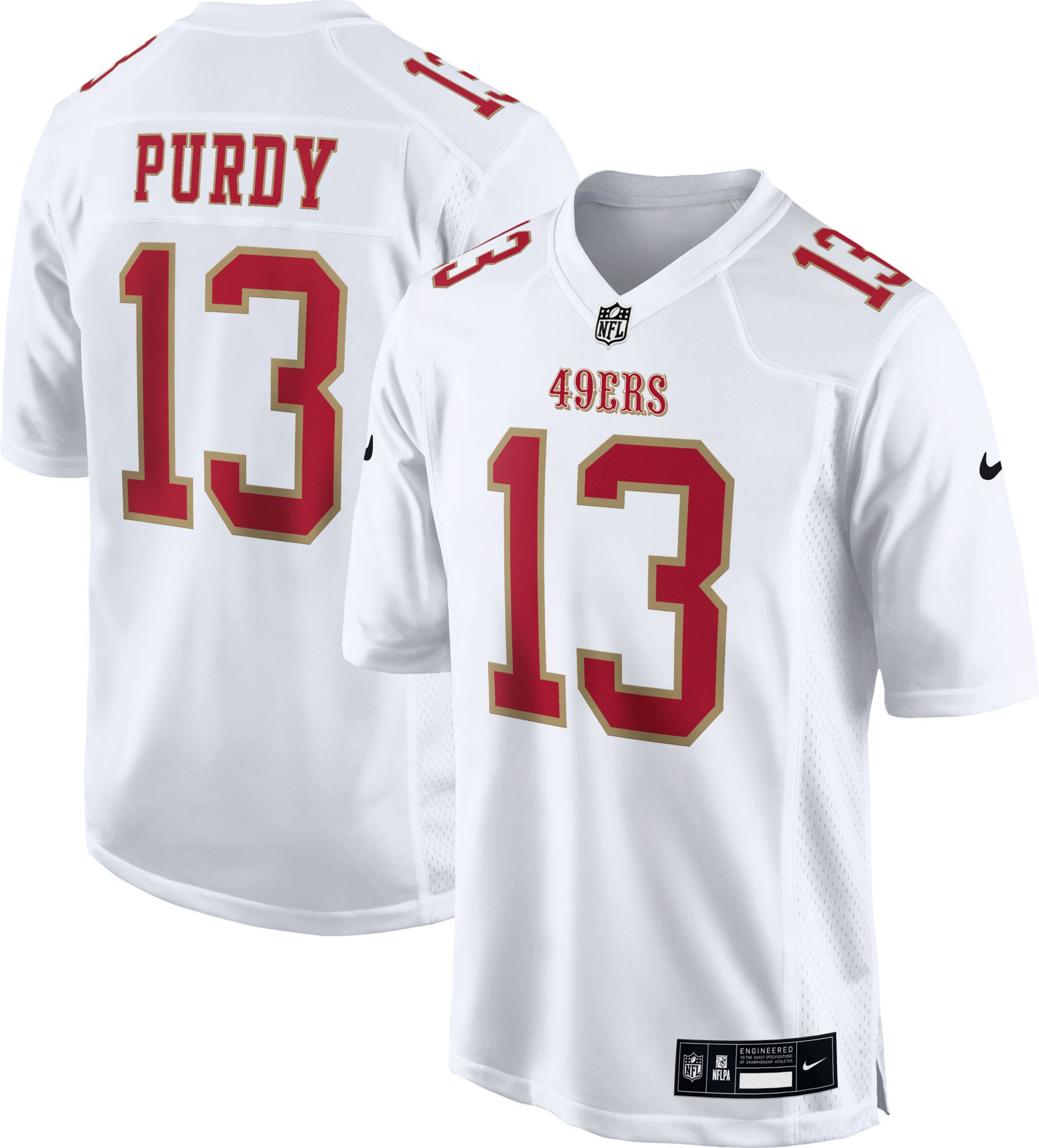 Show your team spirit in style with the Nike Men's San Francisco 49ers Brock Purdy #13 Fashion White Game Jersey. Perfect for game day, tailgates, or casual wear, this lightweight, athletic-fit jersey features strategic mesh-ventilation side panels and a tagless neck collar for ultimate comfort. With screen-printed name, numbers, and logos, plus a stitched down NFL Shield at the neckline, you'll be ready to cheer on the 49ers in official licensed gear.