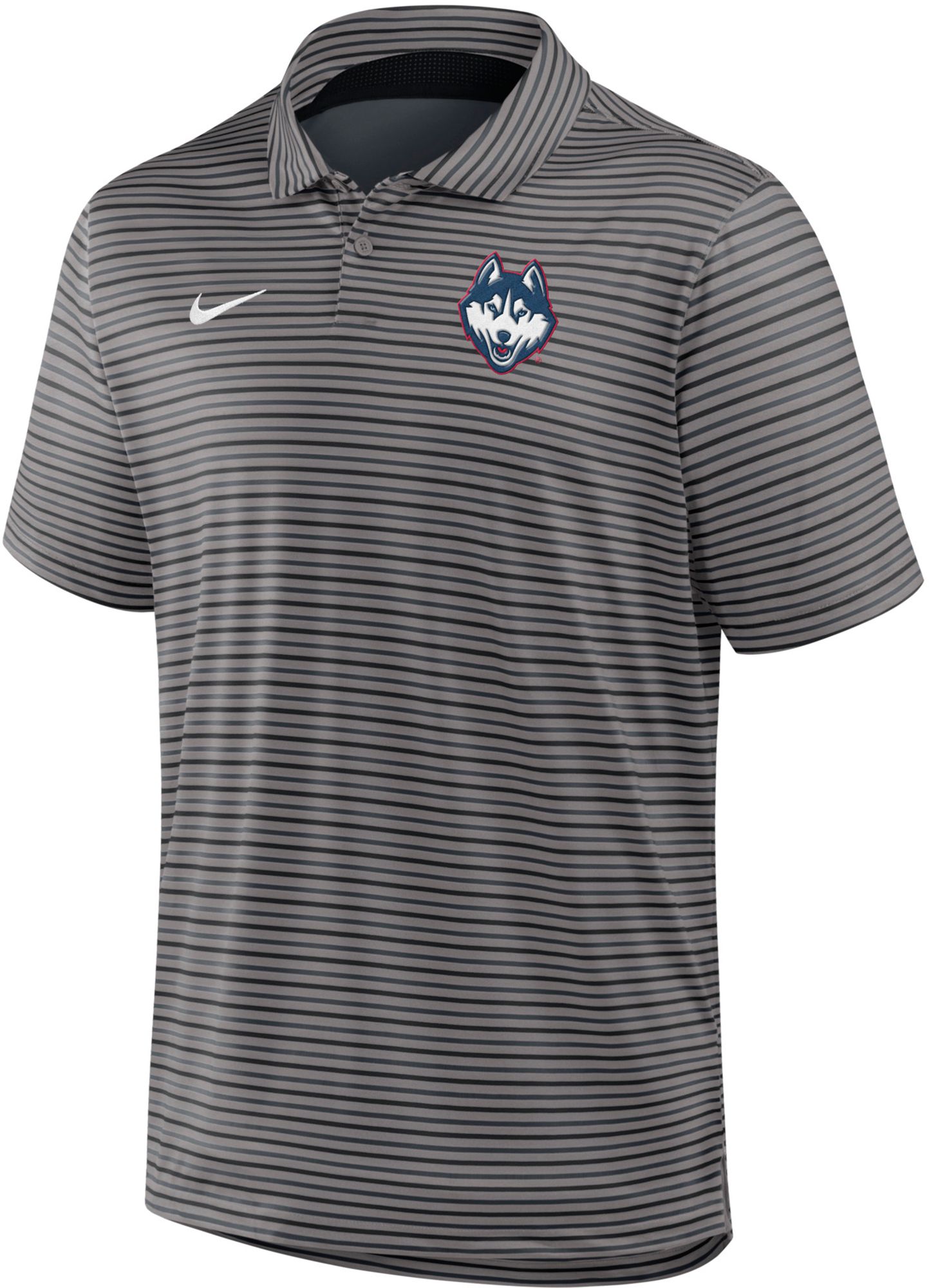 Bought the gray striped shirt, will be great for golf and work. The logo and Huskies symbol are sewn on. Good quality.