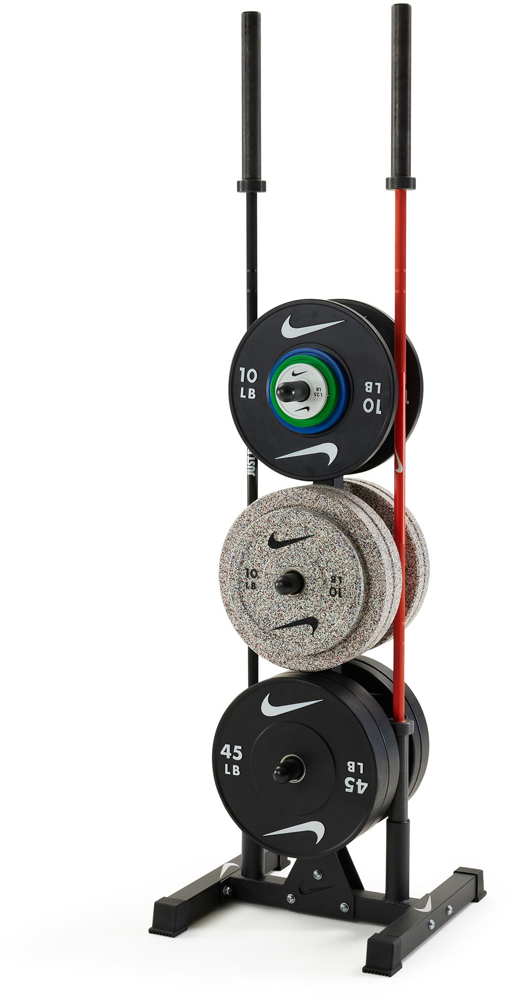 Nike Plate Tree & Barbell Holder - go to solution to organize your weights and barbells. This plate tree features 6 posts for weight plate storage and two protective slots for barbell storage. This plate tree is compatible with all Nike Plates (Black Bumpers Plates, Nike Grind Bumper Plates, Change Plates) and fits most standard Olympic plates. Plates slide on and off easily and allow for quick access when unloading and loading equipment.