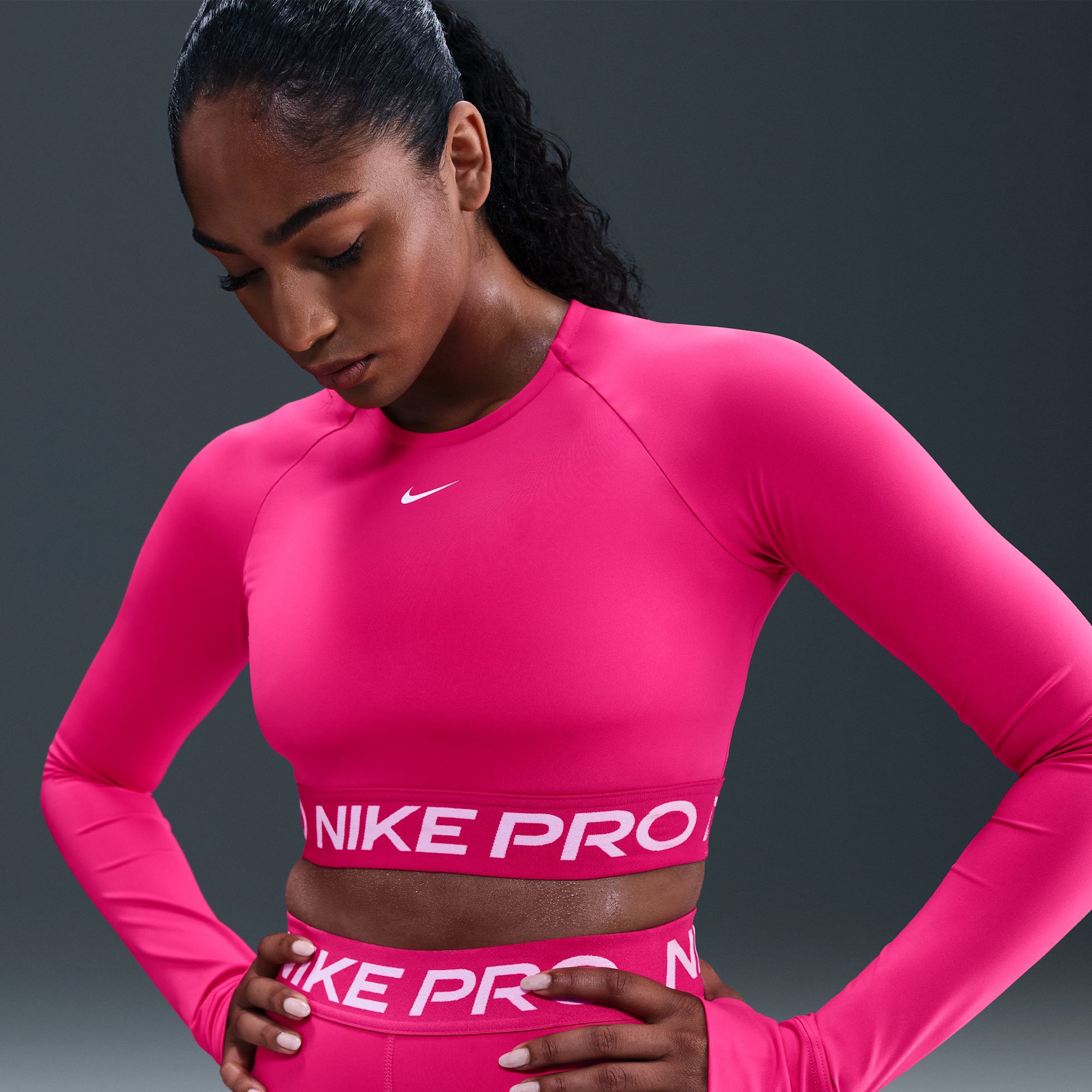 Get your sweat on in this cropped Nike Pro top. Lightweight and stretchy, the smooth fabric dries quickly to help you stay ready when your workout heats up. With a body-hugging fit and soft jacquard elastic band at the hem, you can feel secure as you crush your goals.