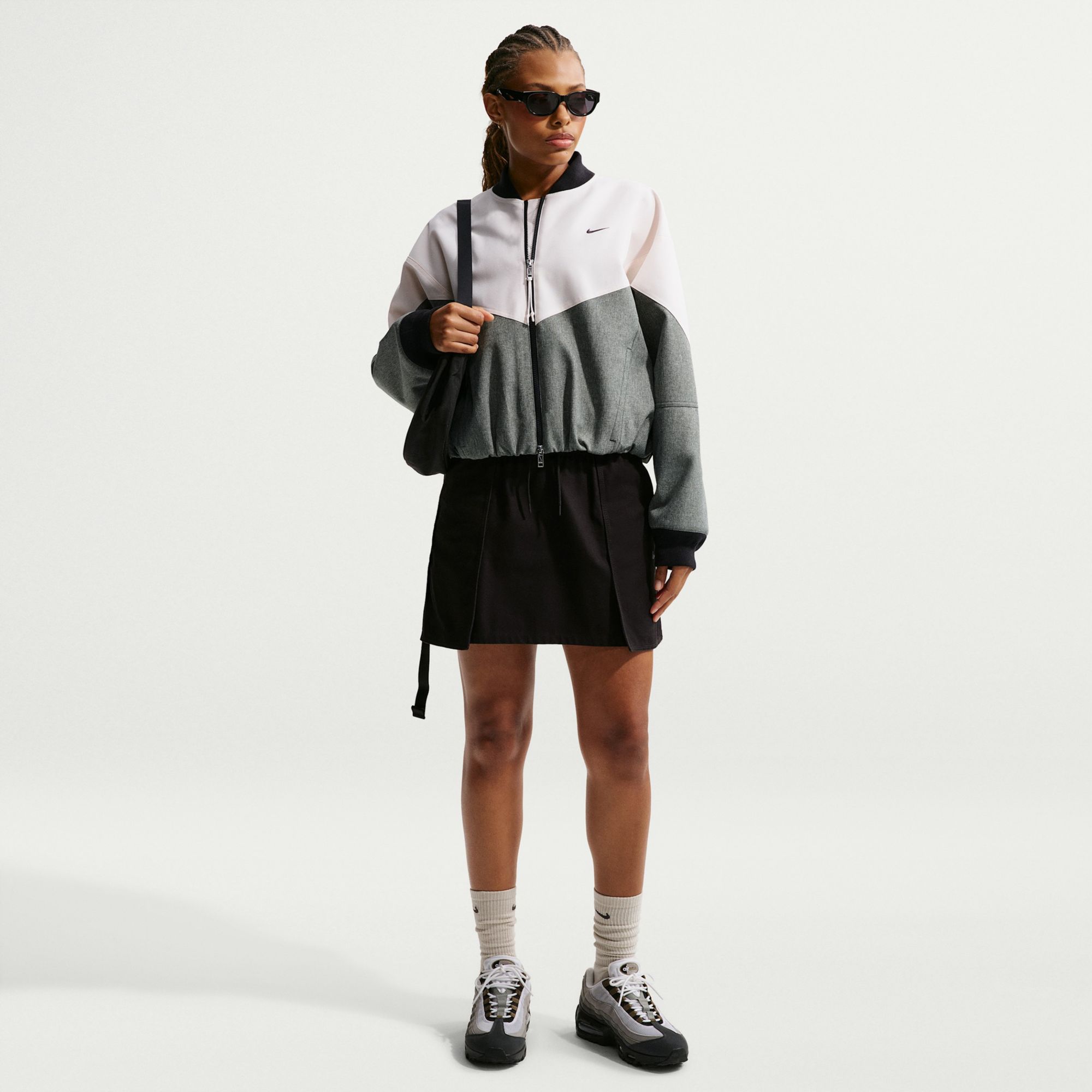 An extra roomy fit, dropped shoulders, voluminous sleeves and a high-low hem give this bomber jacket a modern, bubble-like shape.