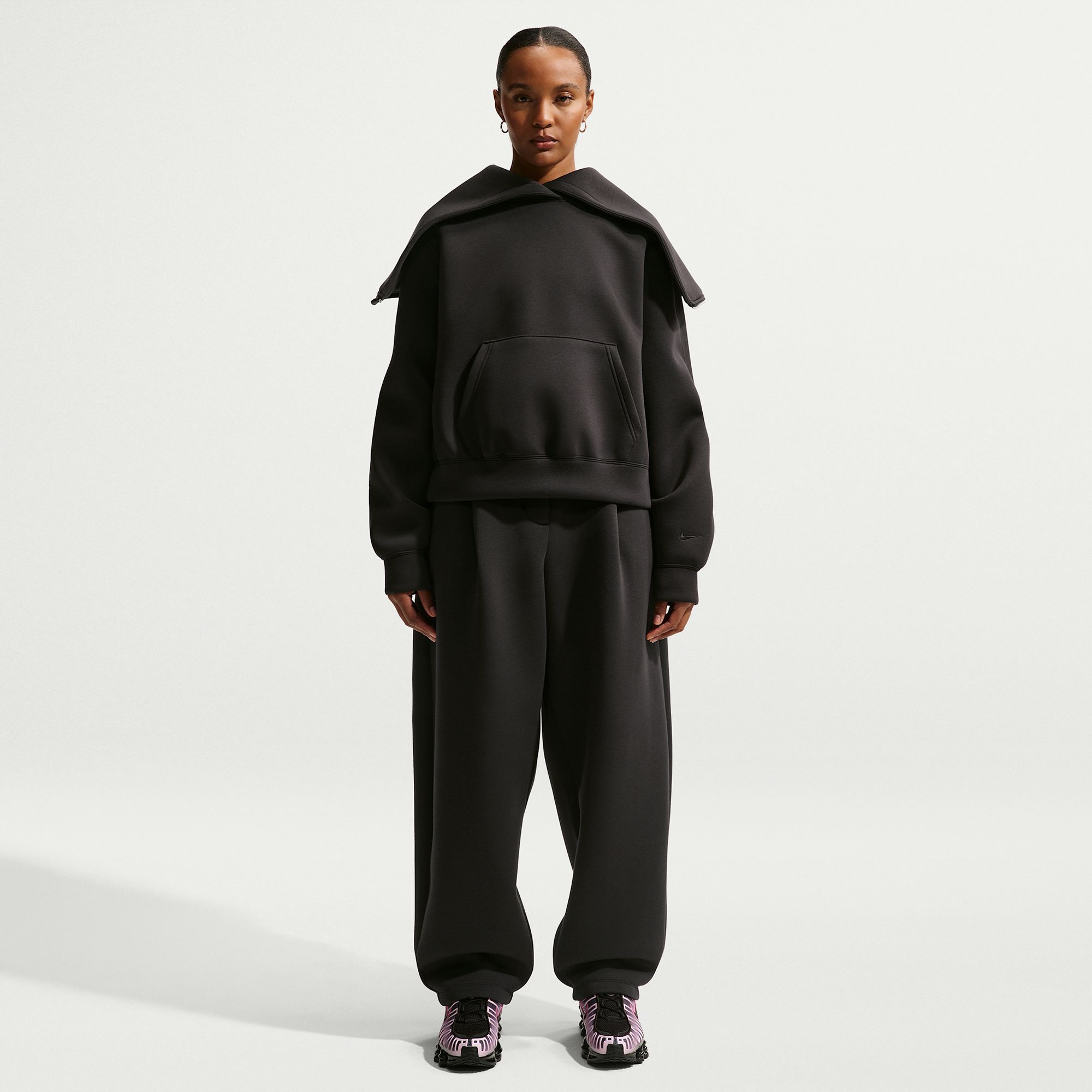 Premium fabric and intentional details give this hoodie a polished look. Smooth-on-both-sides fleece has a soft and structured feel. A zipper in the center of the hood offers versatility while articulated tucks along the sleeves add dimension.