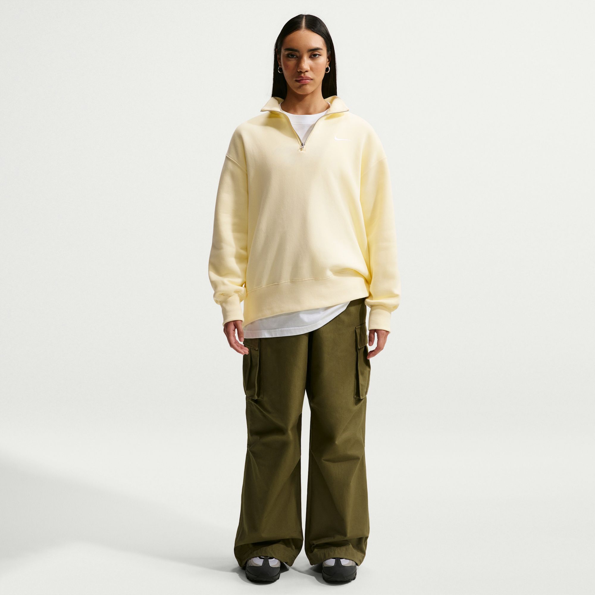 This cozy fleece 1/4-zip sweatshirt feels extra soft on the inside and smooth on the outside. Dropped shoulders and extra-wide ribbing enhance the oversized, extra-long look.