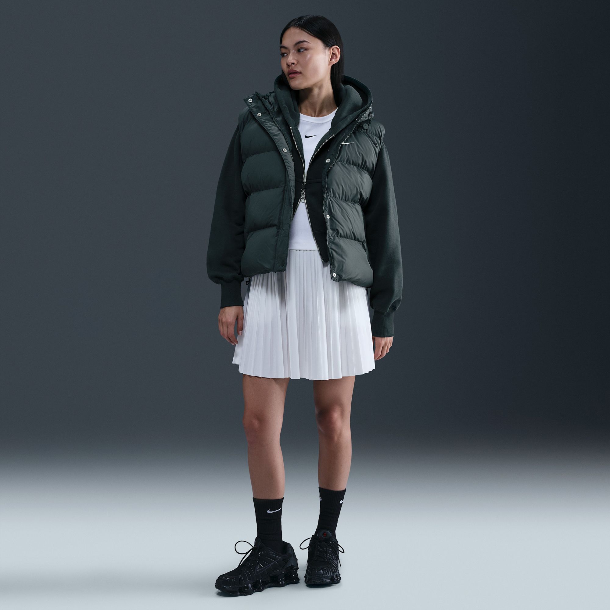 Brush off the cold in this roomy vest. The water-repellent ripstop fabric and big hood help shield you from light rain, while the Therma-FIT technology help keep you warm in cold-weather conditions.