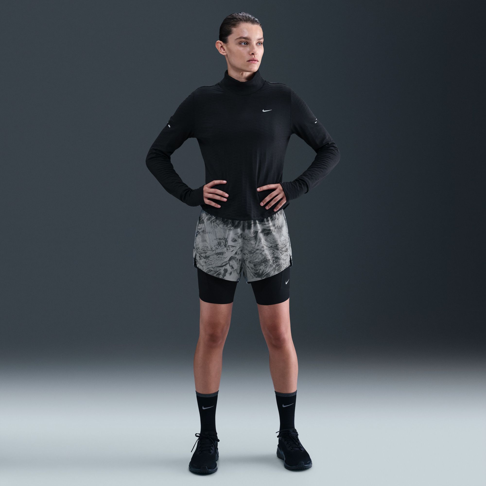 Day or night, stay ready in these Swift running shorts. Their smooth, structured fabric is reflective, and the stretchy inner shorts wick sweat to help keep you dry. Three different pockets secure your phone while the 2-in-1 design gives you optimal coverage stride after stride.