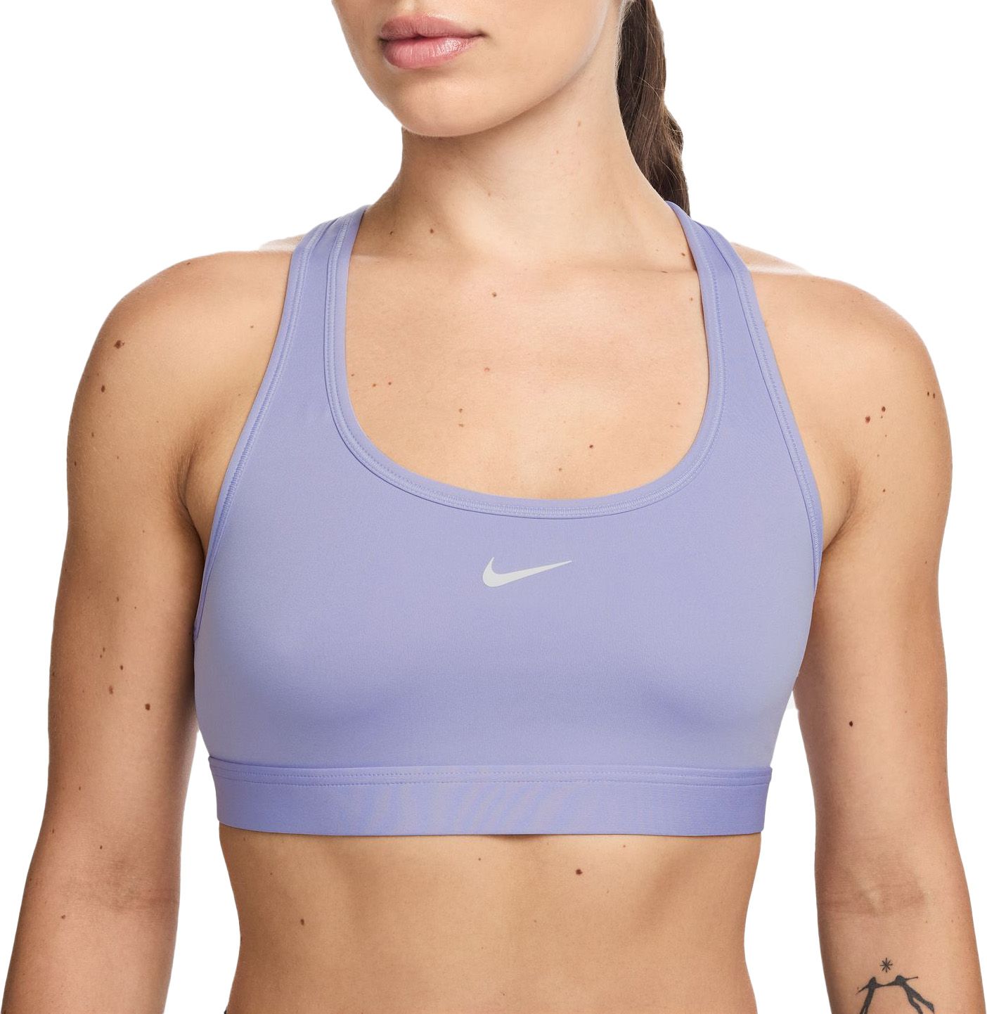 Find the perfect balance of coverage and comfort in this Swoosh sports bra. Light support gives you a gentle hold with plenty of freedom that's great for low-impact workouts or all-day comfort. Sweat-wicking, adaptive material quickly recovers its shape so you can stay comfortable. And when it's time to change, a minimal silhouette with widened armholes makes getting in and out of your bra a breeze.