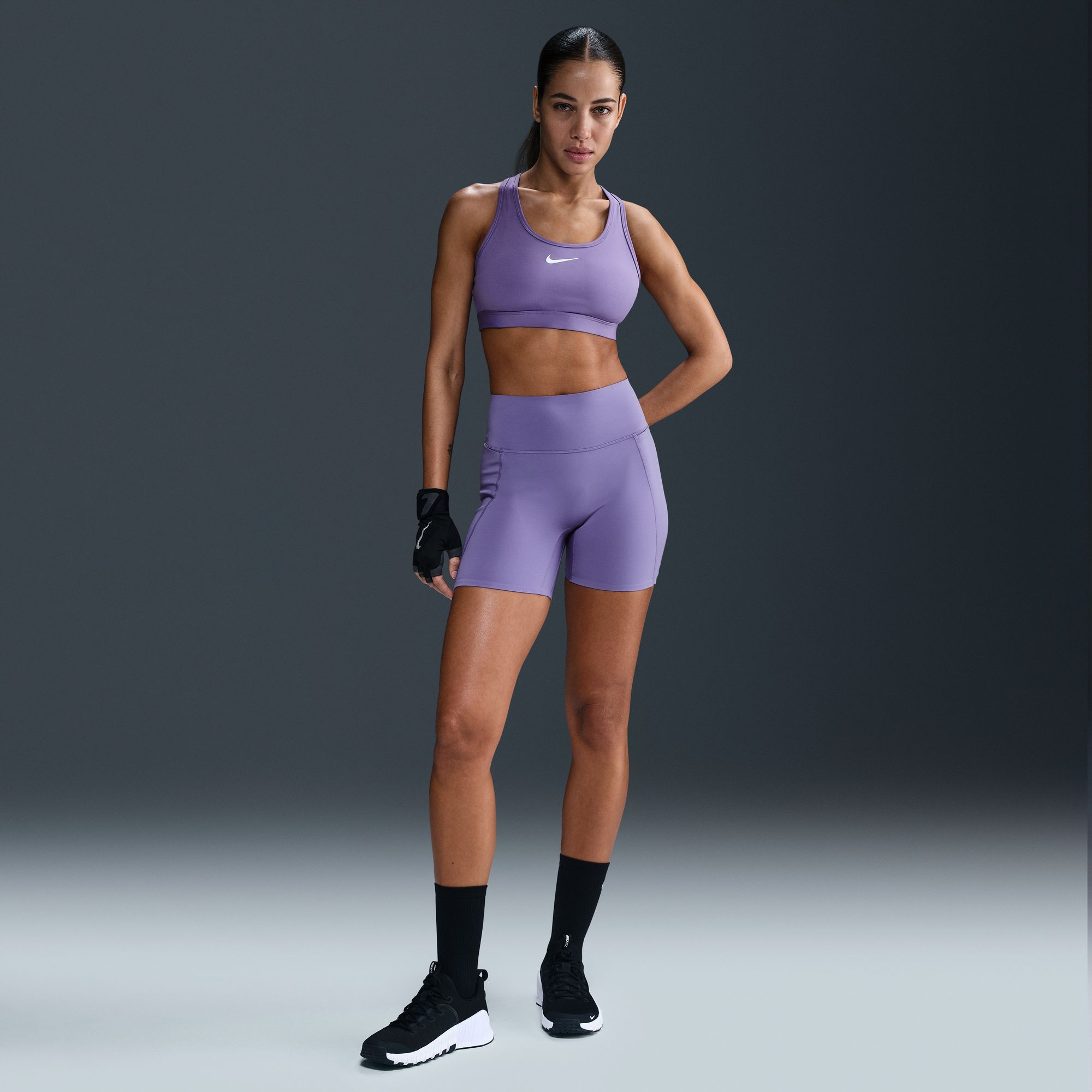 Don't let 'em see you sweat. Nike elevated the design of their Universa biker shorts to look smooth and help conceal sweat, thanks to a no-seam front and moisture-concealing technology. Their midweight, ultrasmooth fabric offers squat-proof stretch that helps lift and shape. Plus, an updated waistband resists rolling, so you can go all out with confidence.