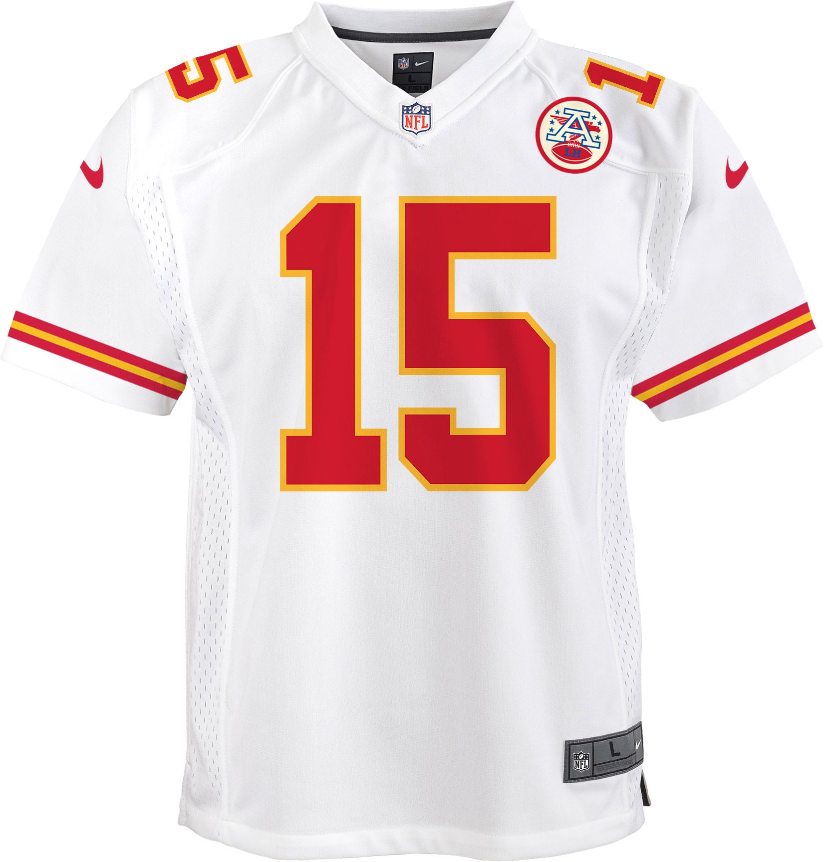 Sling it on Sundays! Let your youngster emulate their favorite quarterback in style with the Nike® Kansas City Chiefs Patrick Mahomes #15 Away Game Jersey.