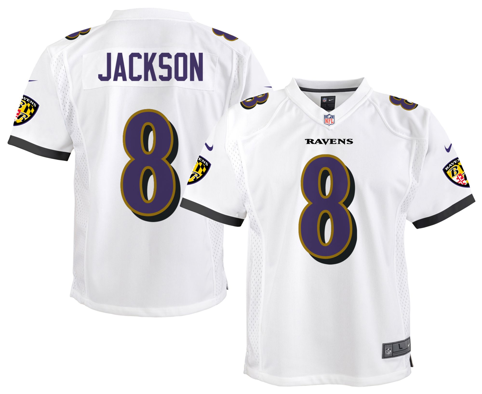 Nike Youth Baltimore Ravens Lamar Jackson #8 White Game Alternate Jersey