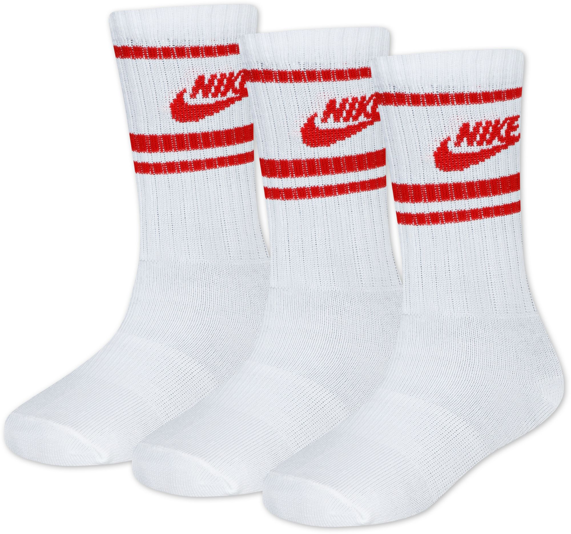 Kids can be Swooshed out down to the socks in these crew socks from Nike. They're made of a breathable cotton/poly flat knit blend boosted with quick-drying, moisture-wicking Dri-FIT technology to help keep their feet cool and dry while they play. They feature jacquard knit stripe logos and a ribbed arch support band to help ease or prevent pain while helping with balance.