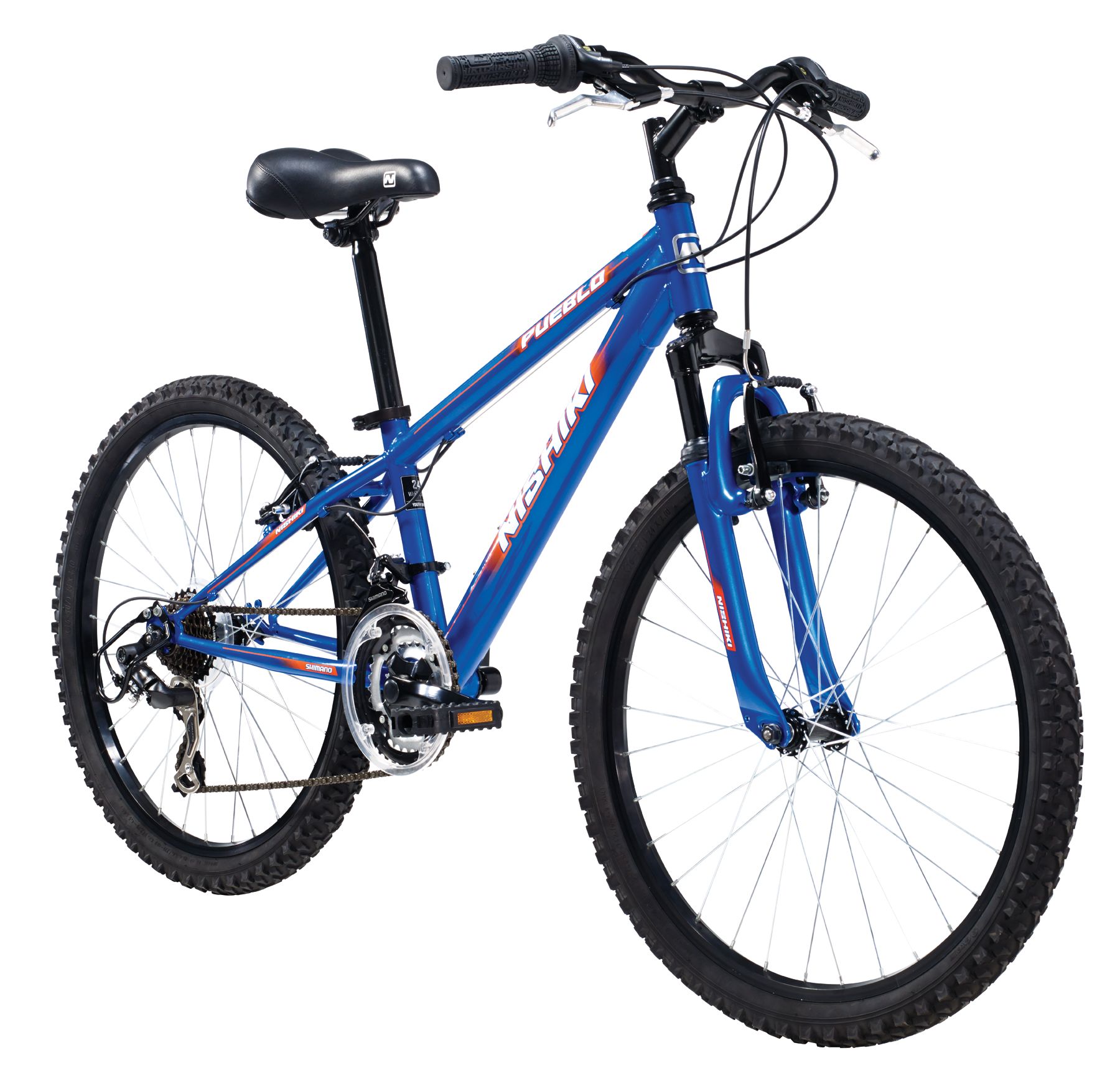 The Nishiki® Boys’ Pueblo 24 in. Mountain Bike will spark his sense of adventure and outdoor fun. It features a strong steel frame with front suspension to absorb bumps from uneven terrain, easy-to-use linear pull brakes for quick and confident stops, and a sport saddle for comfort. The Shimano Revo twist shifter allows him to get in the right gear every time.