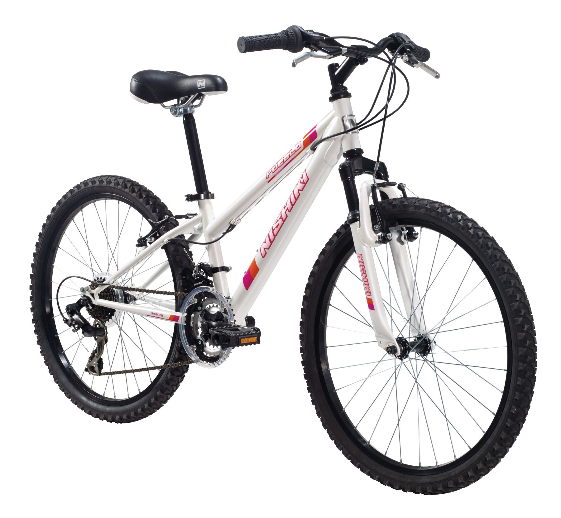 The Nishiki® Girls’ Pueblo 24 in. Mountain Bike will spark her sense of adventure and outdoor fun. It features a strong steel frame with front suspension to absorb bumps from uneven terrain, easy-to-use linear pull brakes for quick and confident stops, and a sport saddle for comfort. The Shimano Revo twist shifter allows her to get in the right gear every time.