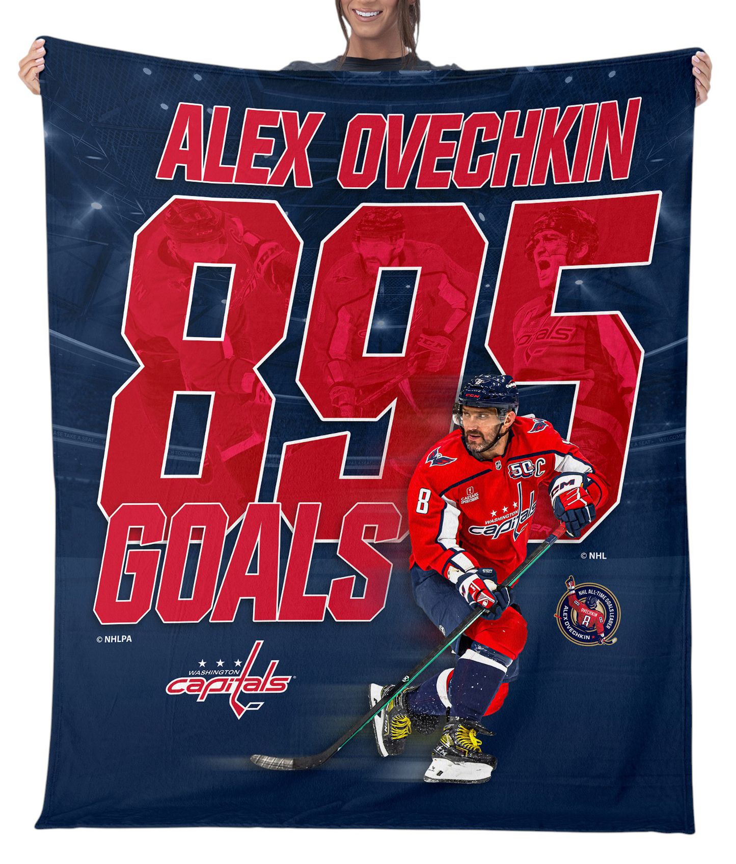 Featuring a bold graphic of Ovechkin in action alongside the massive “895 GOALS” tribute, this blanket pays homage to one of the greatest goal scorers in hockey history