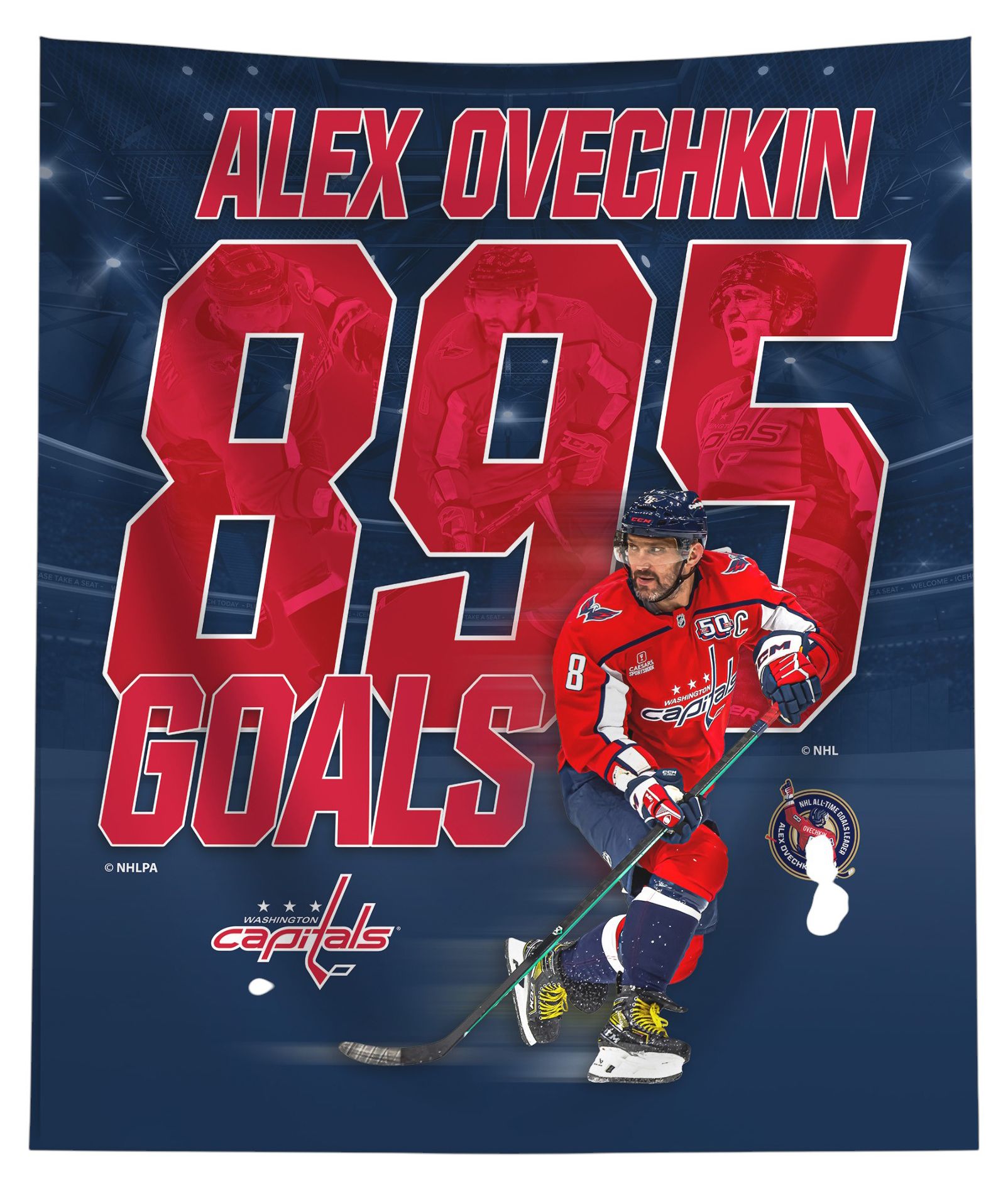 Featuring an electrifying tribute to Ovechkin’s record-breaking goal milestone, the design showcases bold red lettering, dynamic action photography, and official team and league logos