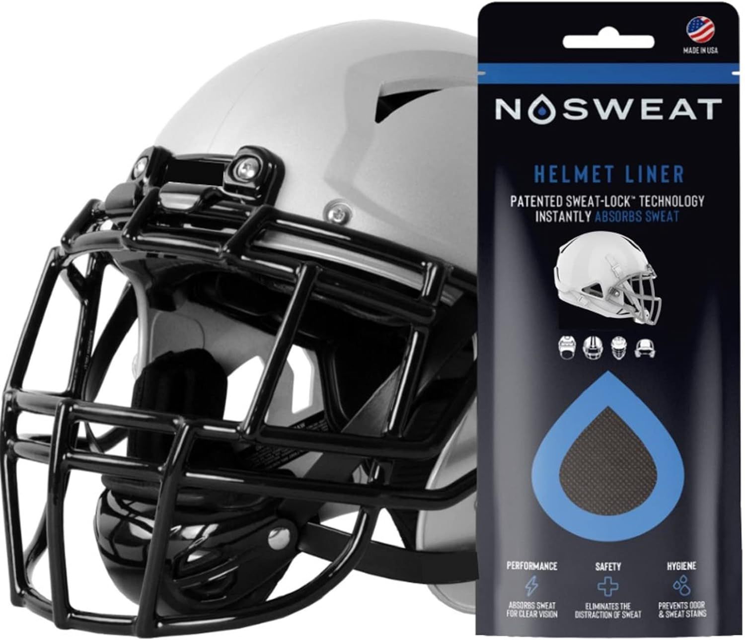 Introducing NoSweat® Football Helmet Liners - the ultimate solution for those sweaty and uncomfortable moments during intense football games. Our disposable moisture-wicking performance liners come with patented SweatLock™ Technology that quickly and efficiently absorbs sweat, keeping your face shield clear and cool, and allowing you to stay focused on the game. Simply attach the liner inside your football helmet and experience the difference for yourself. Don't let sweat distract you from the action - trust NoSweat® to keep you in the game.
