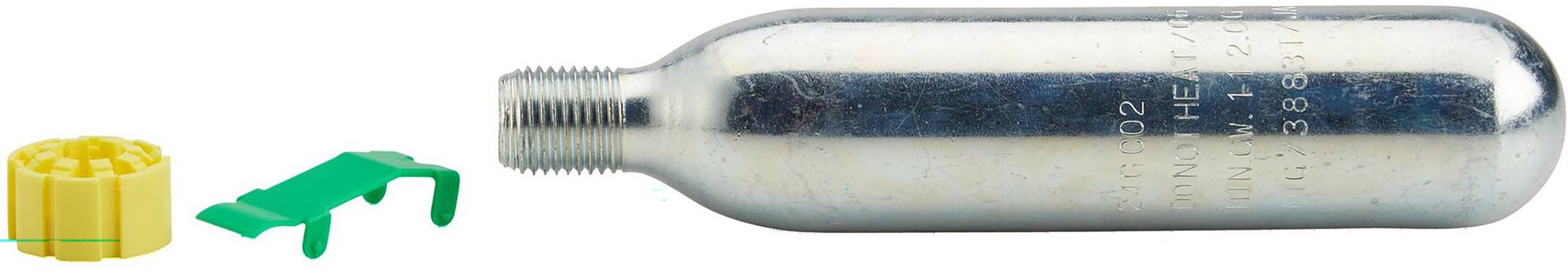 Easy to re-arm, this kit includes (1) 24g CO2 canister with 1/2" thread, (1) yellow bobbin, (1) green indicator clip and instructions.