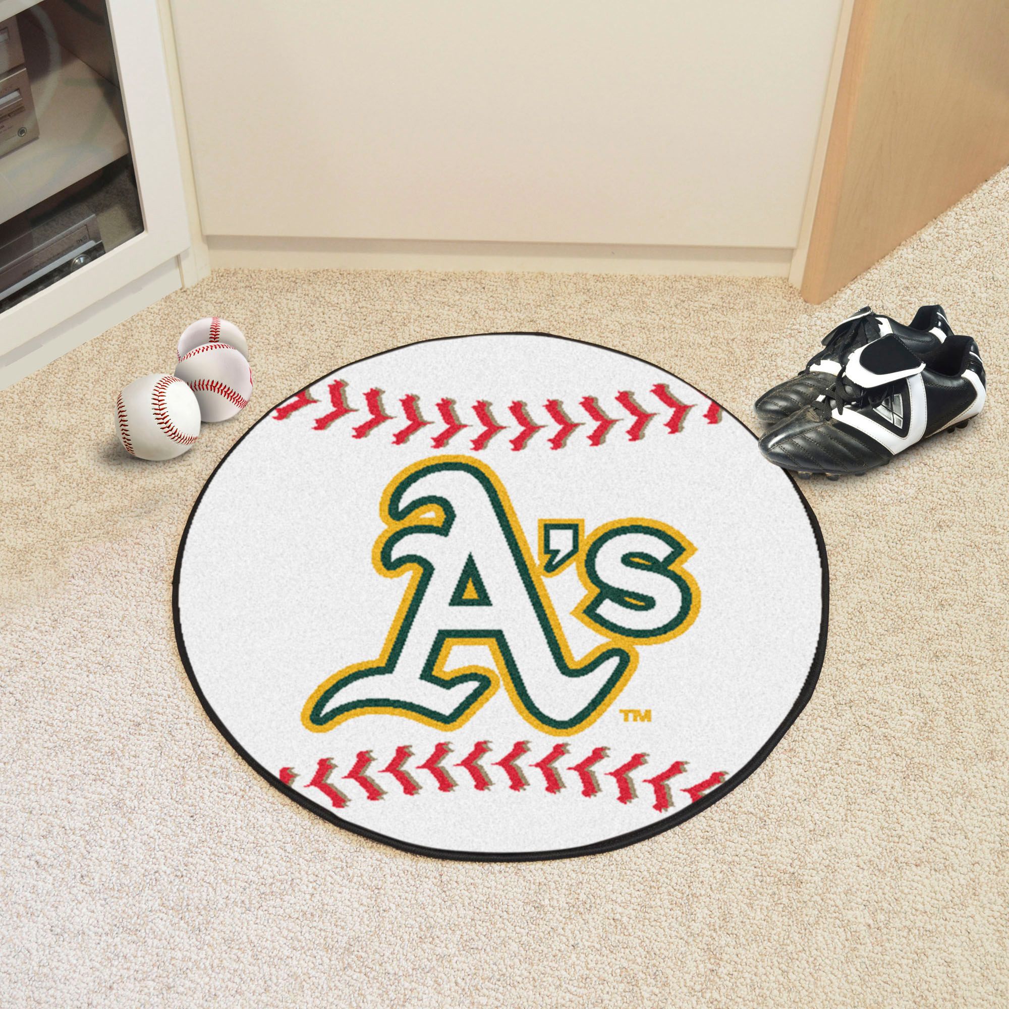 Show your passion for the Oakland Athletics through your home décor with the FANMATS® Baseball Mat. This baseball-shaped area rug is made with 100% nylon and features a recycled non-skid vinyl backing. The FANMATS® Baseball Mat is proudly made in the USA and officially licensed by Major League Baseball®.