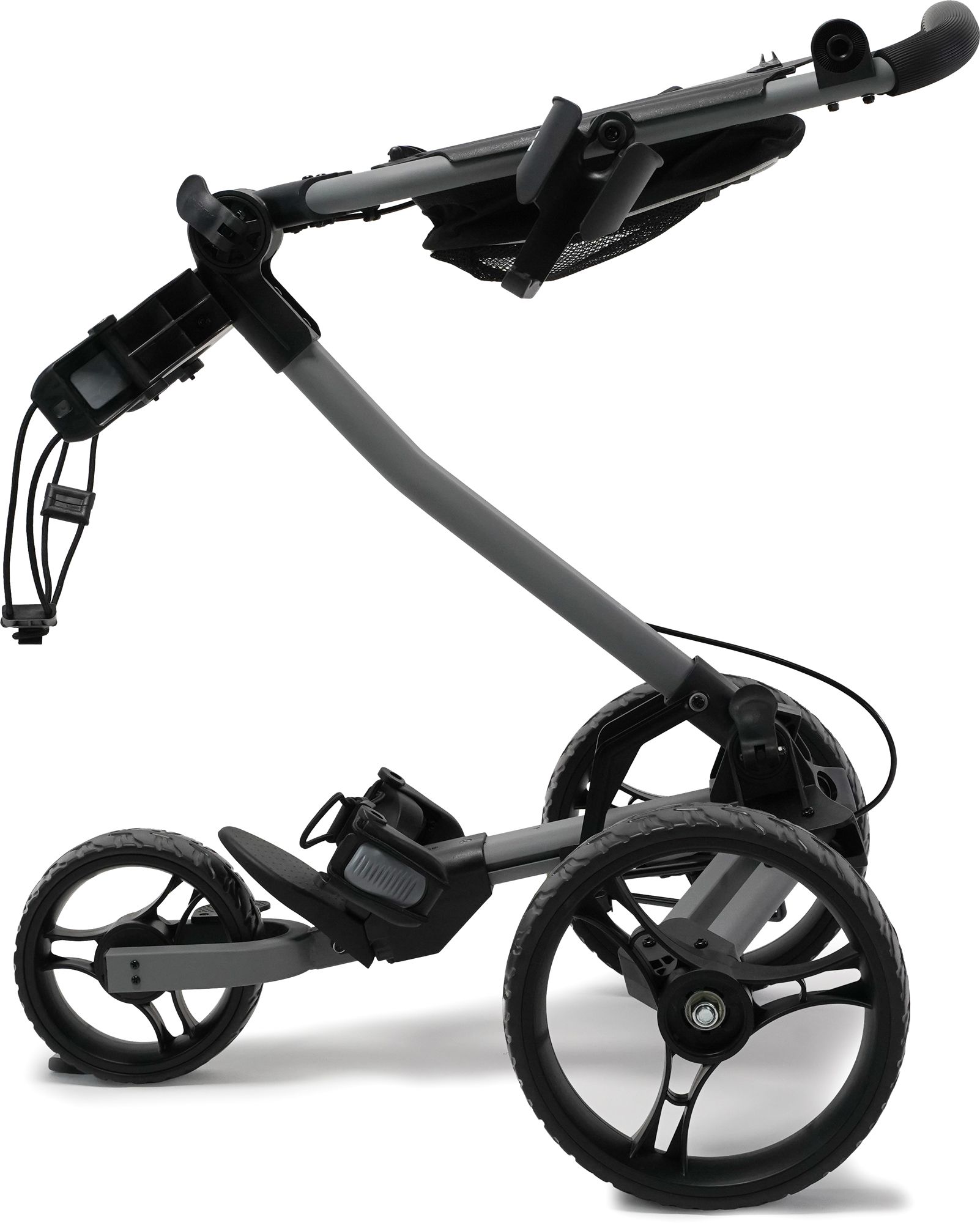 This was a replacement cart. It opens and folds up easily compared to my neighbor's Bag Boy. It it not heavy (I am a retired lady). The hand brake is ok, a steel cable lever gizmo. I wish the wheels were less smooth as the brake doesn't work as well on steeper inclines. The height is fine. The handle connection feels a bit non-solid as the connection to the rest of the cart is a plastic one. I wish it were just a bit more solid and hope it lasts a long time. Expensive, but everything is that way now. i bought this online without being able to inspect it in person. Next time, I would go to a place where I could do so. Easy to store.