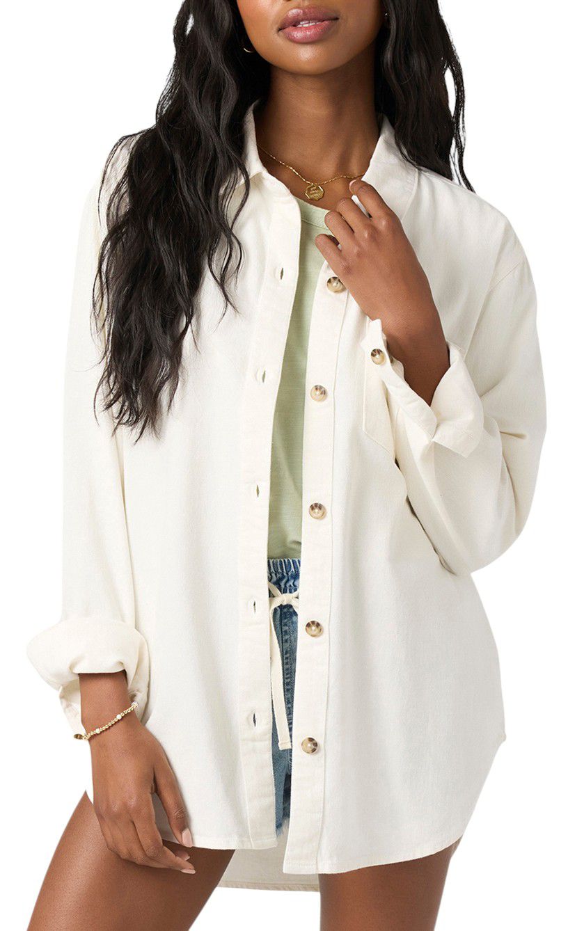Perfect for layering over your favorite tee or tank, this heavier long sleeve top features a front button design with collar, solid color wash and comfy oversized fit.